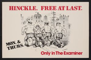 San Francisco Examiner 'Hinckle. Free At Last.' Advertising Poster by R. Crumb 1985 A fantastic illustration by Crumb of the pioneering journalist Warren Hinckle (and his dog!) being arrested promoting his column for the San Francisco Examiner. High quality print on heavy cardstock. 21" x 13 3/4". |