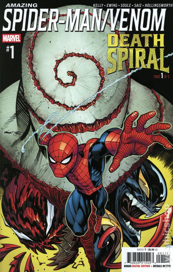 (W) Charles Soule; Joe Kelly; Al Ewing (A) Jesus Saiz (CA) Ed McGuinness FIRST YOUR FRIENDS. THEN YOUR FAMILY. THEN YOU. The next epic SPIDER-MAN and VENOM crossover starts here and continues through April! A new super-powered serial killer is on the loose and they're coming for Spidey, Venom and everyone in between. But what terrible secret has CARNAGE learned, and what does it have to do with Spider-Man?! 32 pages, rated T, full color Cover price $5.99.