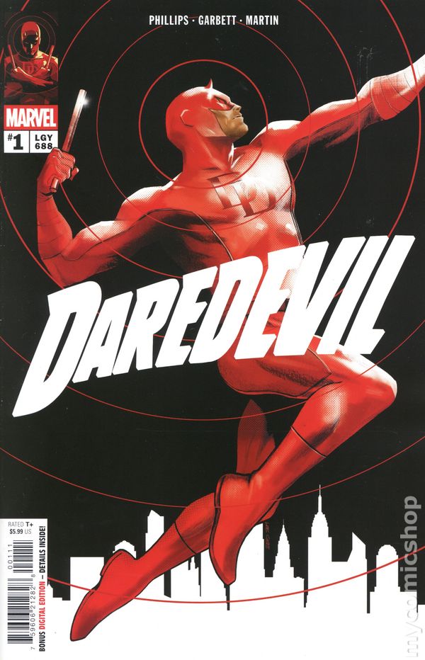 (W) Stephanie Phillips (A) Lee Garbett (CA) Lee Garbett YOU CAN BURY THE BODIES, BUT NEVER THE GHOSTS! Hell's Kitchen is full of secrets - but no secret stays buried for long! As a fearsome new super villain named OMEN has targeted MATT MURDOCK, it will be his alter-ego DAREDEVIL who takes the hits! BUT BEWARE! This mysterious new player isn't all that they appear - a secret Daredevil will have to learn quickly as he scrambles to settle into a life and status-quo we've NEVER SEEN HIM IN BEFORE! Look alive, Marvelites, an all-new and unprecedented era of DAREDEVIL starts right here! 32 pages, full color, rated T+. Cover price $5.99.