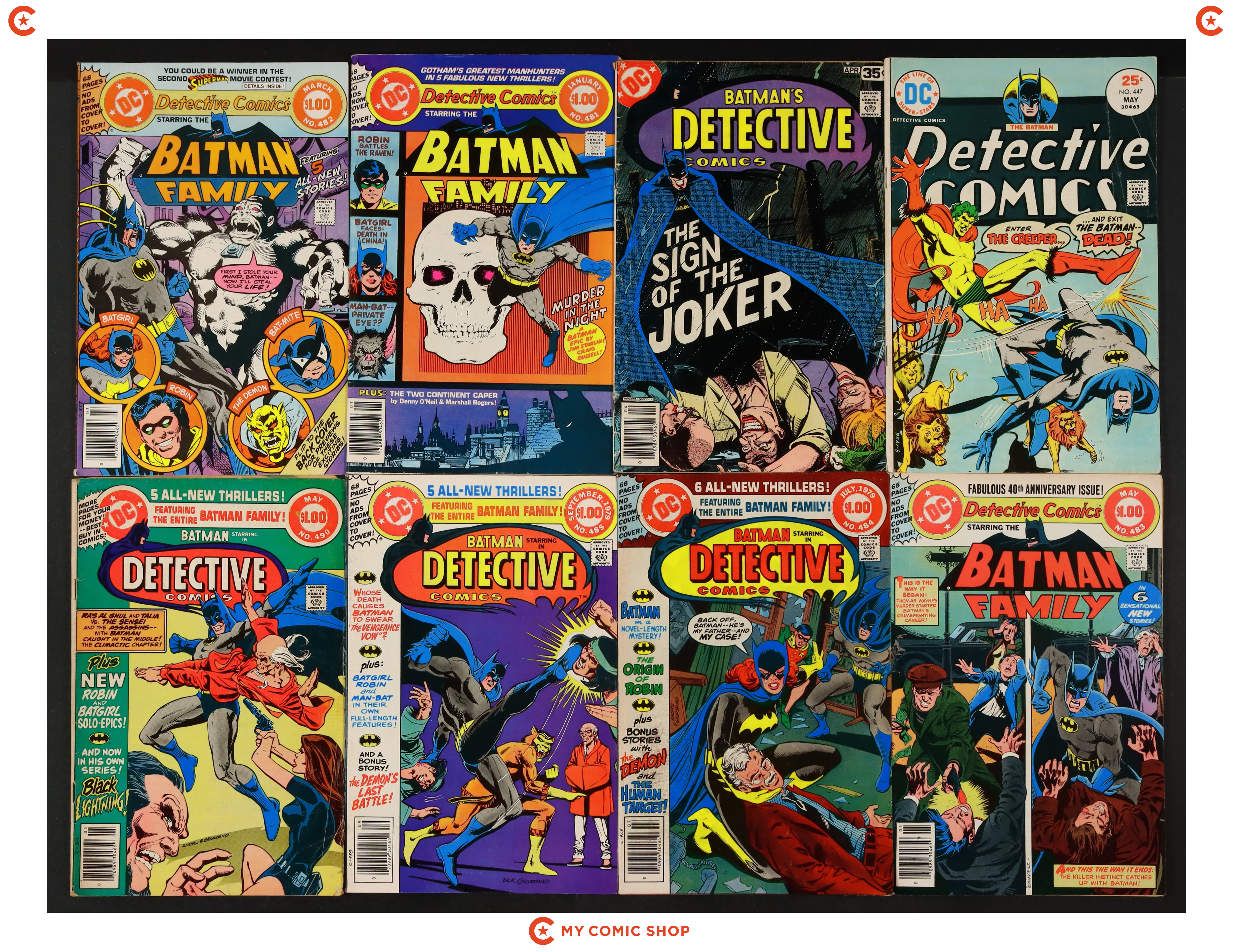 Issues 447, 476, 481-485, and 490 of Detective Comics (1937 1st Series). Most will grade in the FN to VG range with a couple grading closer to GD.