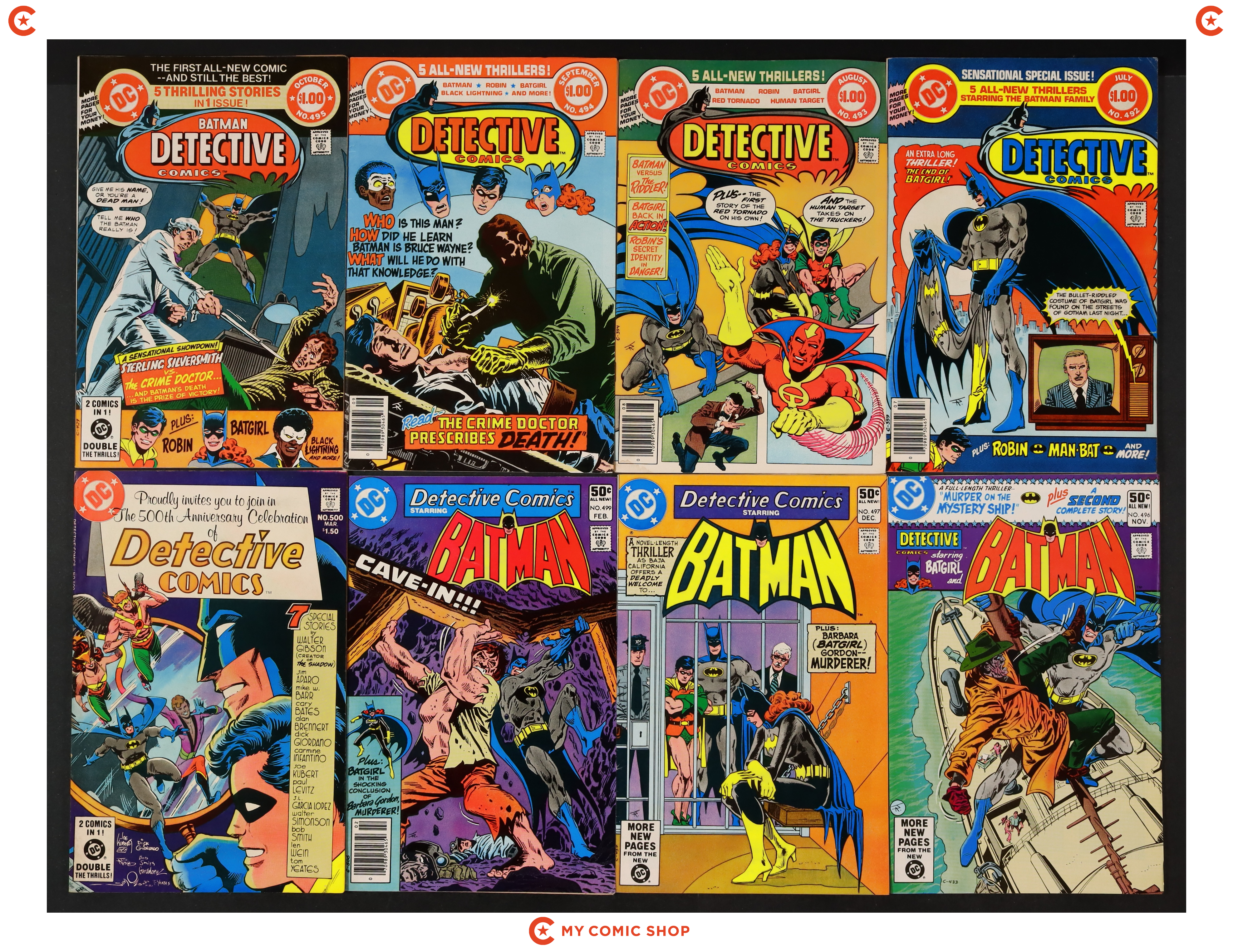 Issues 492-497, 499, and 500 of Detective Comics (1937 1st Series). Most will grade in the FN range with a couple grading VG.