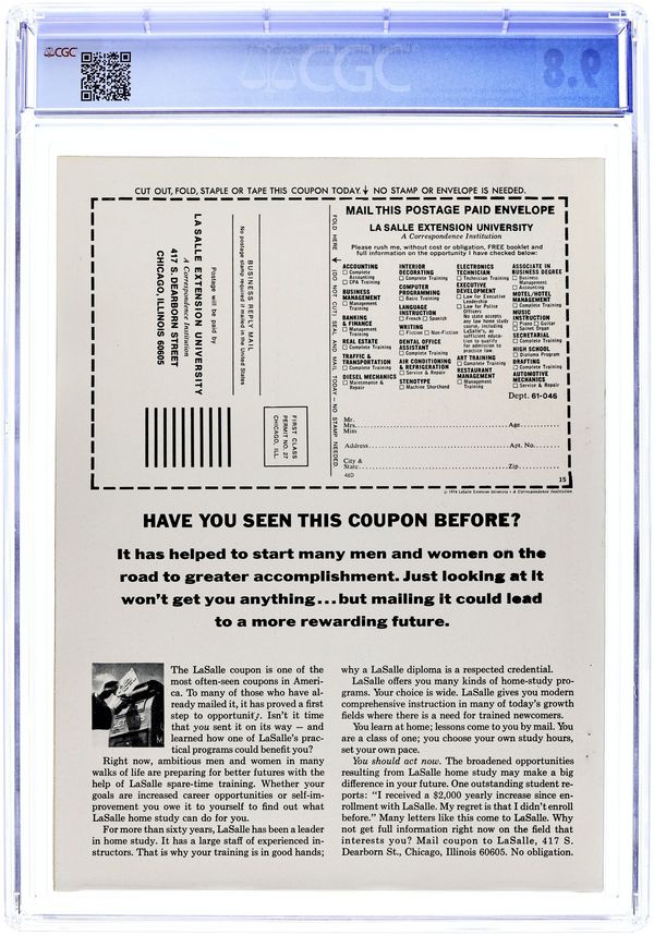 "The Demon is Dying" (script and art by Pat Boyette), "Time Lapse" (art by Leo Duranona), "A Second Life" (script and art by Ramon Torrents), "The Cheese is for the Rats," "Tour de Force," and "Speed Demon," Scripts by Ernie Colon, Augustine Funnell, Martin Pasko, and Villanova. Art by Colon, Leo Summers, and Villanova. Text article, "The Many Horrors of Dan Curtis" by Gary Gerani. Jeff Jones painted cover. Cover price $0.75.