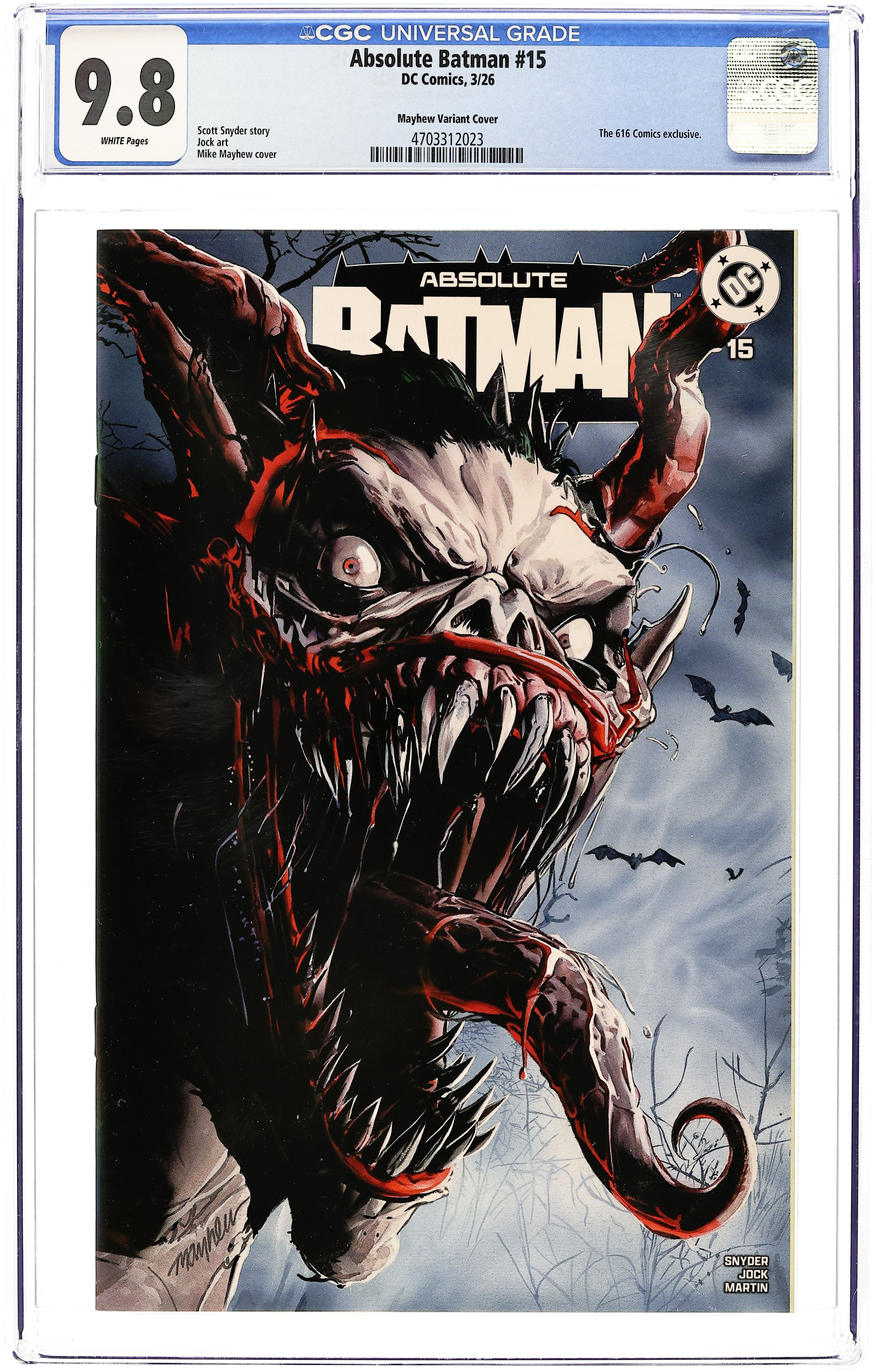 Starts May 4 The 616 Comics Exclusive Variant Cover by Mike Mayhew. Story by Scott Snyder. Art by Jock. SCOTT SNYDER REUNITES WITH LEGENDARY ARTIST JOCK! Alfred reveals to Bruce the story of the man he's been chasing for years. Enter: Joker! Scott Snyder and Jock reunite for an epic tale in the Absolute Universe! 32 pages, full color, rated 15+.