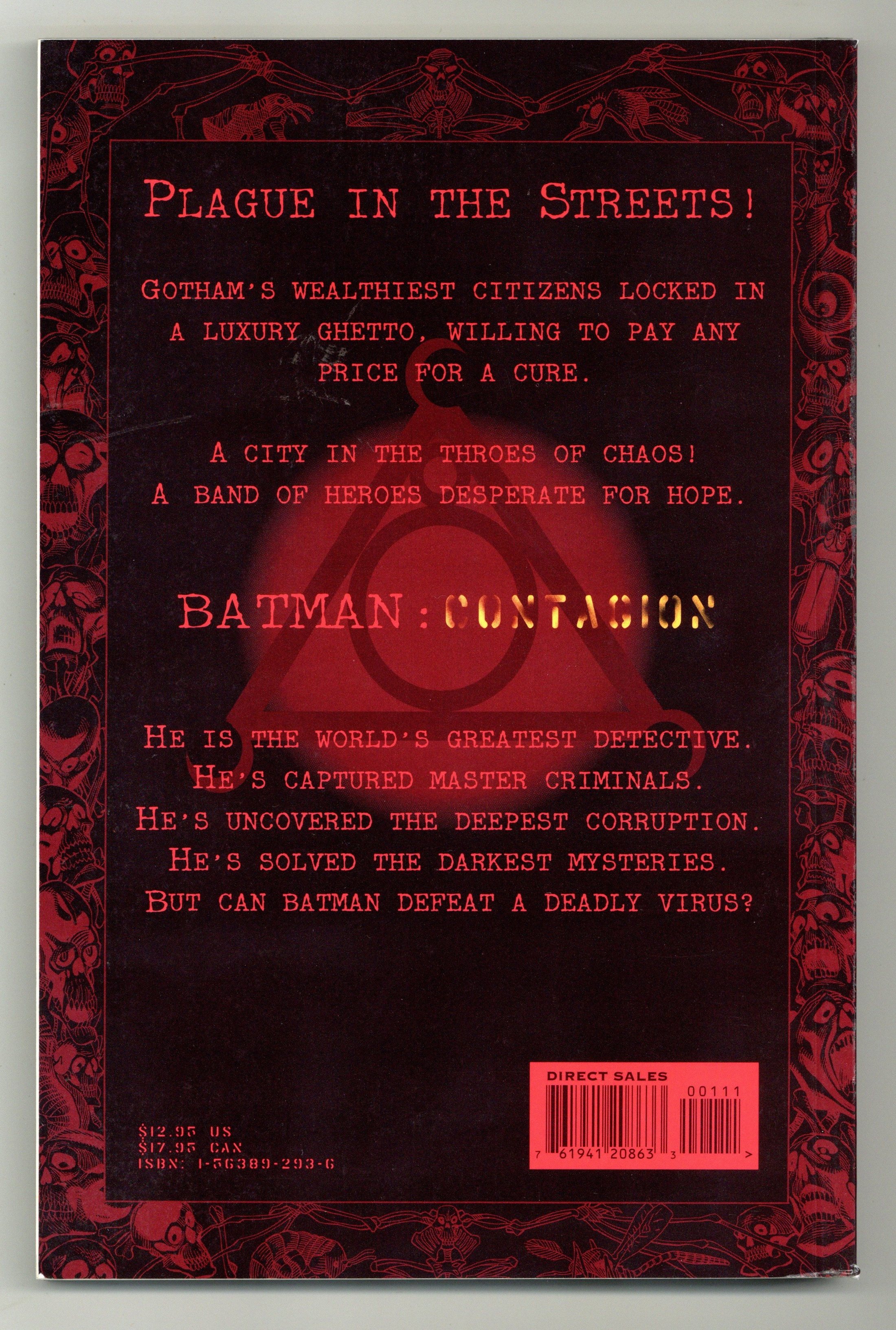 Starts May 4 1st Edition - 1st printing. Collects Azrael Agent of the Bat (1995-2003) #15-16, Batman (1940-2011) # 529, Batman: Shadow of the Bat (1992-2000) #48-49, Batman Chronicles (1995-2001) #4, Catwoman (1993-2001 2nd Series) #31-32, Detective Comics (1937-2011) #695-696, and Robin (1993-2009) #27-28. By Chuck Dixon, ALan Grant, Denny O' Neil, Doug Moench, Christopher Priest, Vince Giarrano, Dick Giordano, Barry Kitson, Mike Wieringo, Jim Balent, Tommy Lee Edwards, Kelley Jones, Graham Nolan, Frank Fosco, & Matt Haley. A mysterious and lethal virus is unleashed on the unknowing inhabitants of Gotham City, causing excruciating pain - and ultimately, death - within 48 hours of contact. Batman, Robin and Nightwing race to contain the chaos while finding a cure, with the help of unlikely allies Azrael, Huntress, Catwoman and Poison Ivy. Softcover, 264 pages, full color. Cover price $12.95.