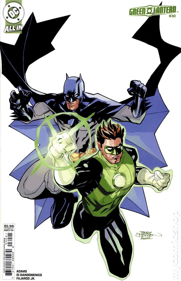 (W) Jeremy Adams (A) Carmine Di Giandomenico (CA) Terry Dodson, Rachel Dodson HAL AND BATMAN TEAM UP--BUT AT WHAT COST?! Hal looks for help from Batman, the World’s Greatest Detective and Green Lantern’s greatest frenemy, as the information from the Book of Oa begins to reveal itself in his mind. Cover price $5.99.