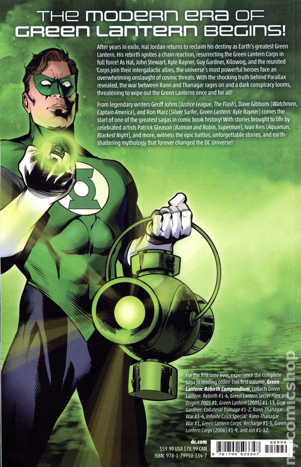 Volume 1 - 1st printing. "Rebirth!" Collects in Reading Order: Green Lantern: Secret Files and Origins (1998-2005 DC) #2005, Green Lantern: Rebirth (2004) #1-6, Green Lantern (2005-2011 4th Series DC) #1-13, Guy Gardner: Collateral Damage (2006) #1-2, Rann-Thanagar War (2005) #1-6, Rann-Thanagar War: Infinite Crisis Special (2006), Green Lantern Corps: Recharge (2005) #1-5, Green Lantern Corps (2006) #1-9, and Ion (2006) #1-12. Written by Geoff Johns, Dave Gibbons, Ron Marz, Howard Chaykin, and Keith Champagne. Art by Patrick Gleason, Ivan Reis, Ethan Van Sciver, Greg Tocchini, Howard Chaykin, Carlos Pacheco, Dave Gibbons, Fernando Pasarin, Joe Prado, Simone Bianchi, Darwyn Cooke, Yvel Guichet, Joe Bennett, Tom Grindberg, Paco Diaz Luque, Prentis Rollins, Oclair Albert, Marcelo Campos, Jay Leisten, Jesus Merino, Christian Alamy, Michael Bair, Mike Gray, Jonathan Glapion, Tom Nguyen, Rodney Ramos, Joe Rubinstein, Keith Chanpagne, Jack Jadson, Ray Snyder, Wayne Faucher, and Marlo Alquiza. Cover by Carlos Pacheco and Jesus Merino. FOR THE FIRST TIME EVER, EXPERIENCE THE COMPLETE MODERN GREEN LANTERN SAGA IN READING ORDER! The modern Green Lantern saga begins here! Hal Jordans return from exile reignites the Corps, sets the universe ablaze with conflict, and launches an era of unforgettable battles and cosmic drama. Witness the Rann-Thanagar War, a deep conspiracy within the Corps, and Kyle Rayners ascension as Ion. One of the greatest comic book epics of all time starts now! Softcover, 1,632 pages, full color. Teen Cover price $59.99.