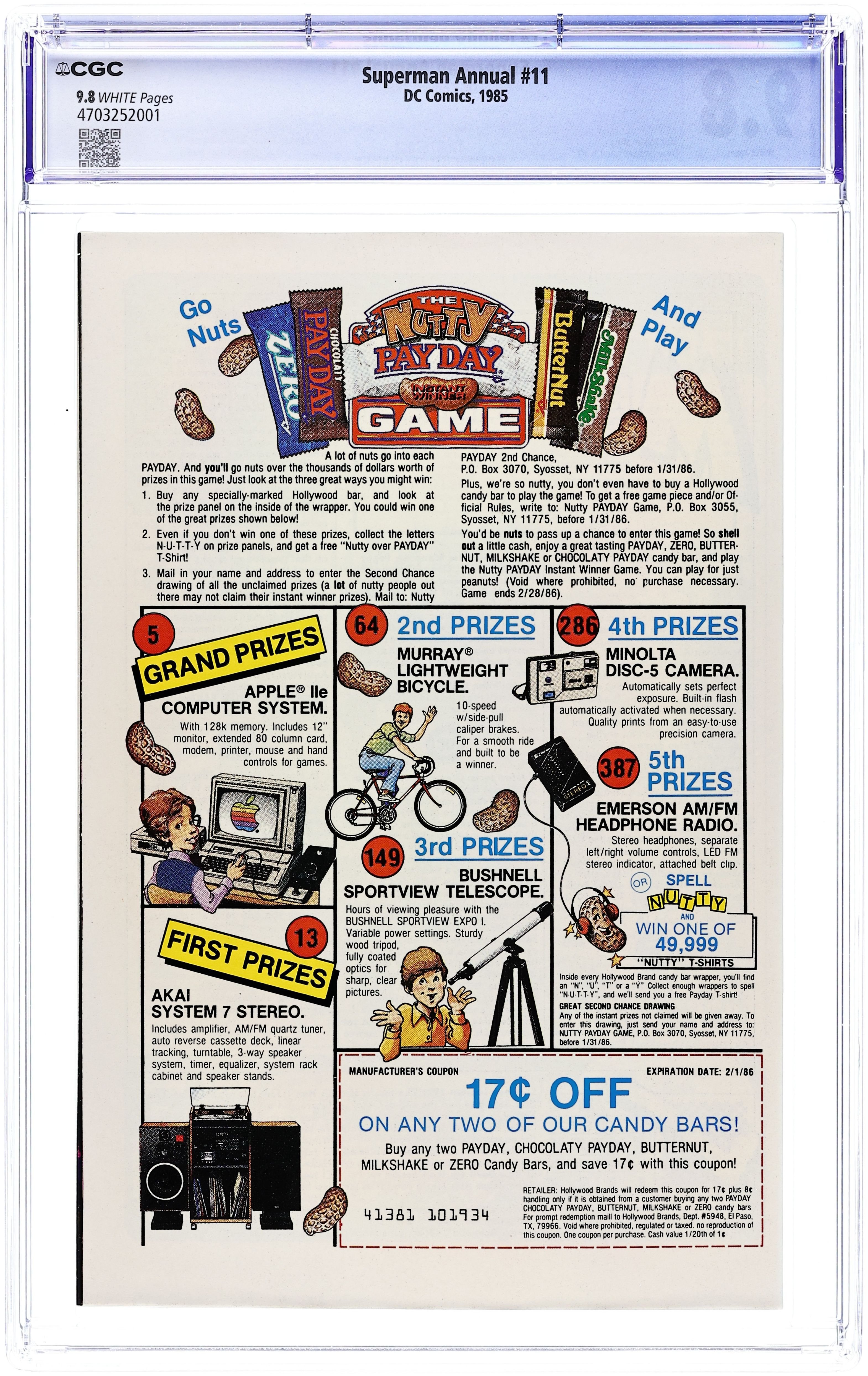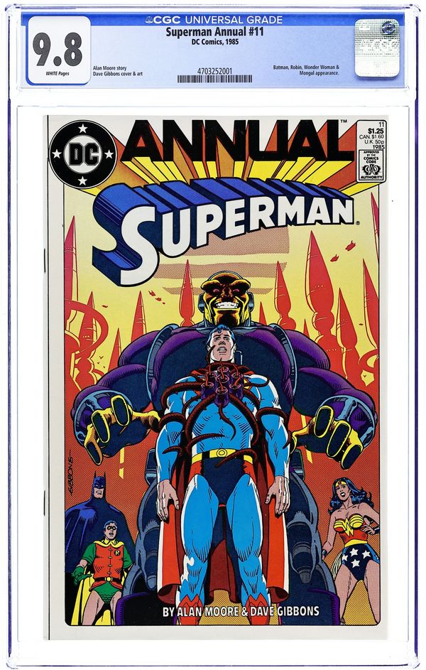 Direct Edition. "For the Man Who Has Everything!" Guest-starring Wonder Woman, and Batman and Robin. Written by Alan Moore. Art by Dave Gibbons. The amazing creative team that brought you Watchmen deliver one of the all-time great Superman tales. When Batman and Wonder Woman arrive at the Fortress of Solitude for Superman's birthday, they soon discover the evil Mongul has beat them there and enslaved the Man of Steel within a prison of his own mind. How can they possibly hope to defeat this monstrous alien menace without the help of Superman? 48 pages, FC. Cover price $1.25.