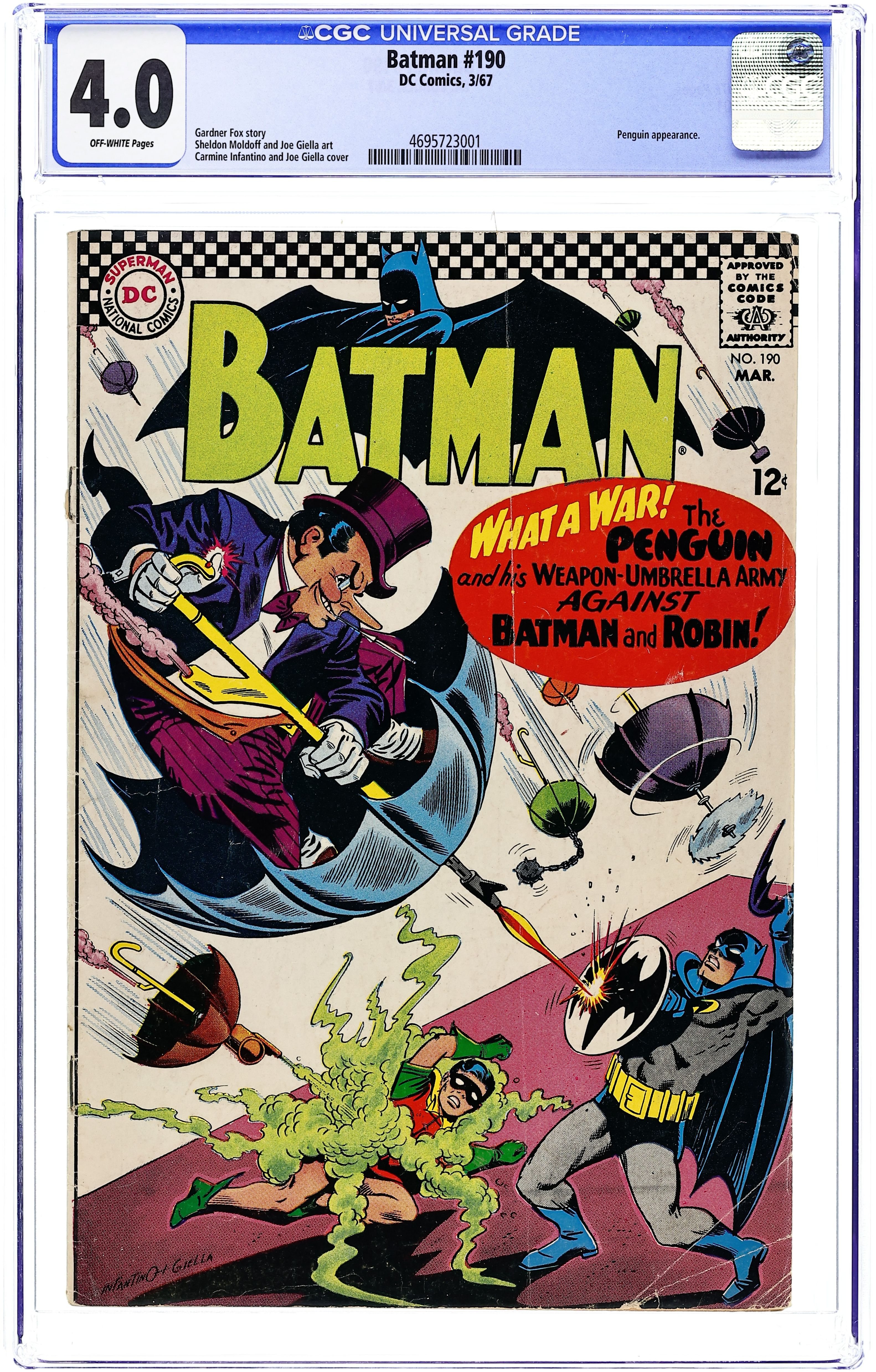 Starts Apr 27 Cover pencils by Carmine Infantino, inks by Joe Giella. Friends Across the Seas public service announcement, art by Sheldon Moldoff. "Genius of the Getaway Gimmicks!", script by Gardner Fox, pencils by Sheldon Moldoff (as Bob Kane), inks by Sid Greene; Roy Reynolds, wanting to not make the same mistakes of other criminals, decides to uses a series of getaway gimmicks on the Caped Crusader to effect the escape of he and his men...and succeeds, until Batman baits a trap of his own. "The Puzzle of the Perilous Prizes!", script by Bill Finger, art by Joe Giella (as Bob Kane); When Batman and Robin investigate who entered a contest for an elderly lady, they end up capturing an entirely unrelated gang who think Batman and Robin are after them. Pore Identification non-fiction half-page, script by Julius Schwartz, pencils by Morris Waldinger, inks by Tom Nicolosi. Letter to the editor from comics writer Mike Friedrich. 36 Pages, Full Color. Cover price $0.12.