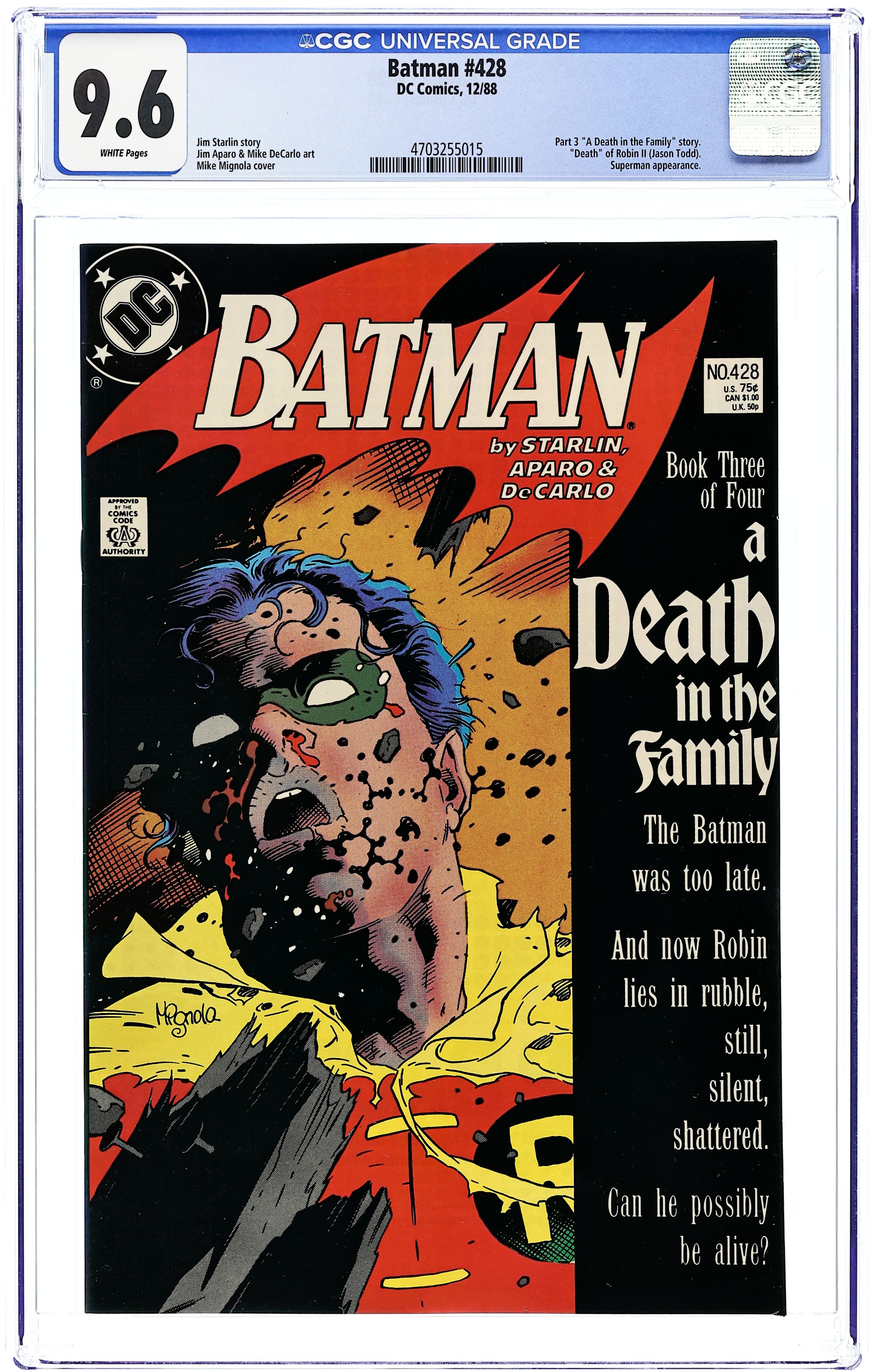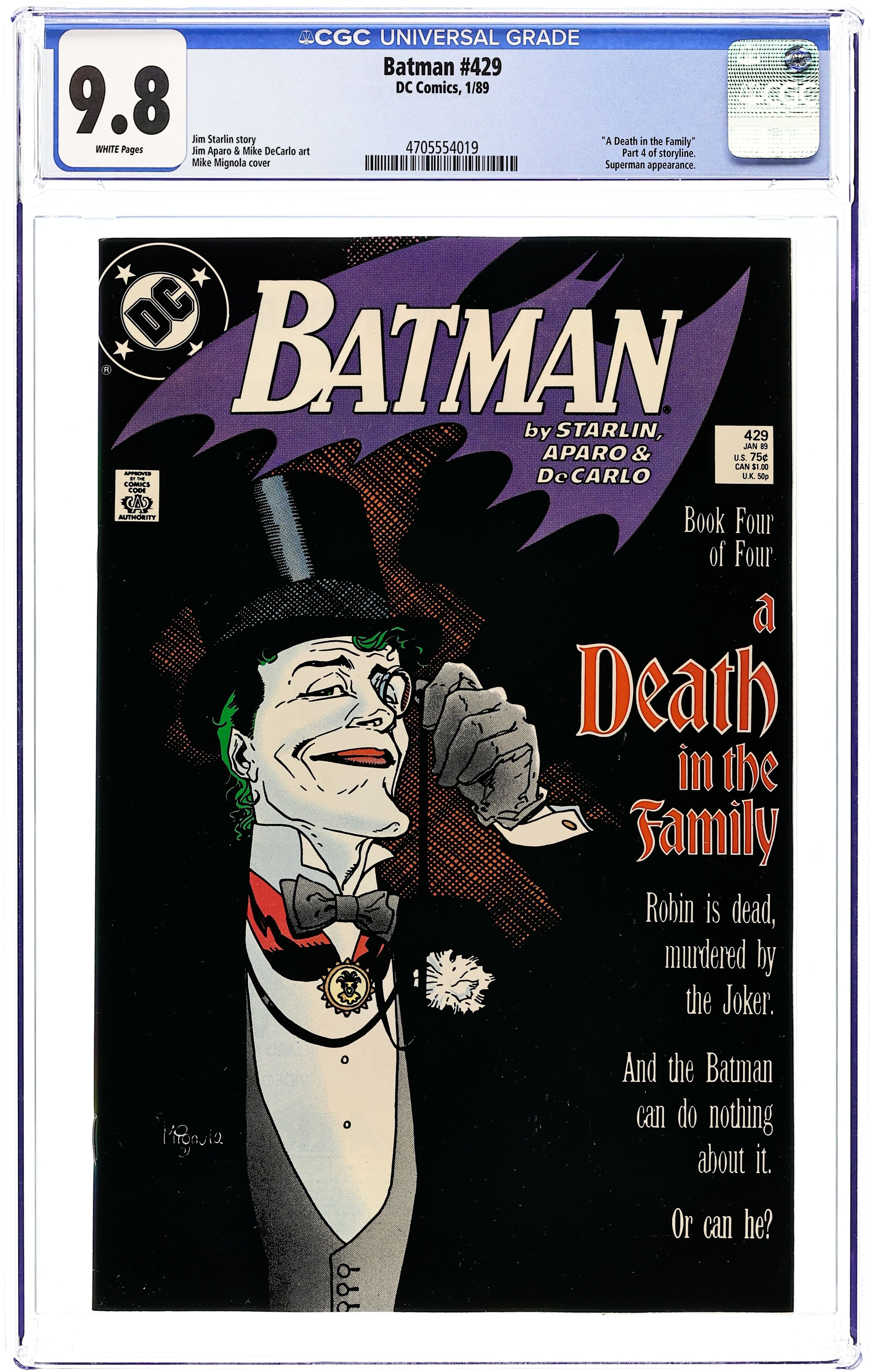 First printing. Newsstand Edition. Cover art by Mike Mignola. "A Death in the Family" part 4 of 4, script by Jim Starlin, pencils by Jim Aparo, inks by Mike DeCarlo; Batman and Superman talk to CIA agent Ralph Bundy about the Joker's diplomatic status; The agent tries to get Batman to leave the Joker alone; Batman goes to the Joker's hotel room; The Joker confirms that he killed Jason; The Joker pulls a gun, but Batman is already gone; At the UN the Joker tries to poison the audience; Fortunately, Superman sucks up all the poison and flies out of the room to release it; The Joker activates bombs; Batman pursues him. NOTE: Most issues from 397-432 were reprinted in 1989 and sold in multipacks. These 2nd and 3rd prints have back cover ads dated 1989. 36 Pages, Full Color. Cover price $0.75.