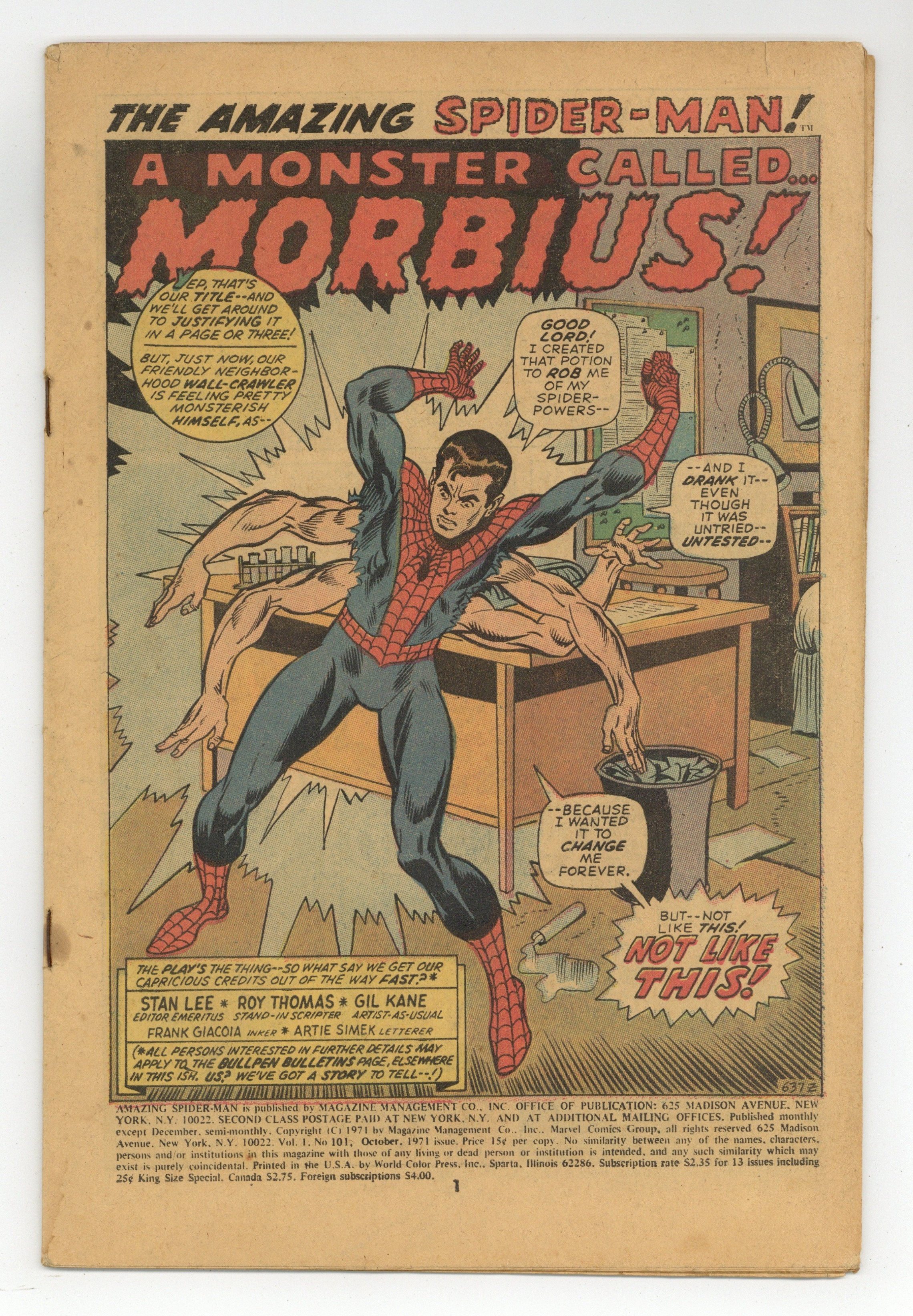Starts Mar 9 First appearance of Morbius the Living Vampire in "A Monster Called Morbius!" Script by Roy Thomas. Pencils by Gil Kane. Inks by Frank Giacoia. Cover by Gil Kane and John Romita. The first 100 issues of the Amazing Spider-Man title are in the books! And the next chapter in the web-slinger's anthology kicks off with the debut of Marvel's first bronze age vampire: Morbius! However, at the moment Peter Parker has a much bigger problem on his (six) hands. After drinking the special potion he developed, Aunt May's nephew grew four additional arms! Oh, my goodness! Peter is desperate to find a way to remove the arms, so he calls Dr. Curt Connors for help. Dr. Connors has a summer house and laboratory in Southampton on Long Island...and he gives Spider-Man permission to stay there and work on a cure. Meanwhile, a strange, pale, and bloodthirsty man is the sole survivor of a shipwreck near Southampton. And he's looking for a quiet place to rest. Oh no. Is the six-armed Spider-Man on a collision course with a living vampire? Oh yes! Cameo appearances by Gwen Stacy, J. Jonah Jameson, Joe Robertson, and the Lizard. Last 15¢ cover price. (Notes: This is the first issue of the Amazing Spider-Man series not written by Stan Lee. There exists a second printing of this issue published in 1992 with a silver background cover. Marvel also published a facsimile edition of Amazing Spider-Man 101 in 2021.) 36 pages. Cover price $0.15.