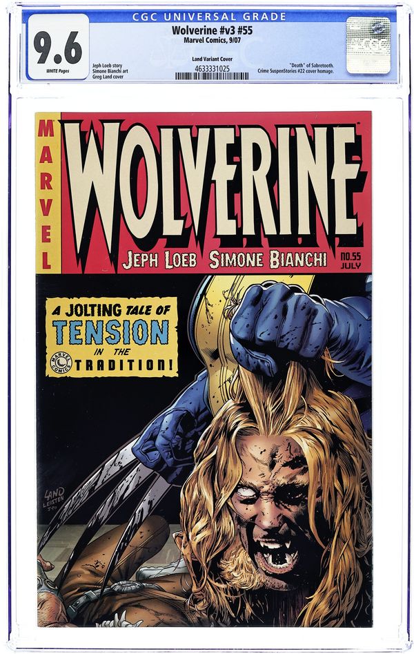 Variant Cover by Greg Land. Written by JEPH LOEB Pencils by SIMONE BIANCHI It's time for the final round in Wolverine's decades-long grudge match with Sabretooth, courtesy of superstars Jeph Loeb (Batman: Hush) and Young Guns reloaded artist Simone Bianchi -- and this time only one of them is walking away. Get ready for one of the most eye-popping endings in recent Marvel history, True Believer! 32 PGS./Parental Advisory Cover price $2.99.