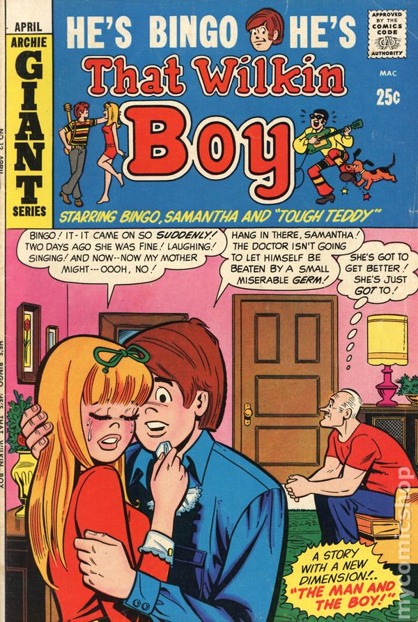 Cover pencils by Stan Goldberg, inks by Jon D'Agostino. Meet Woodrow "Bingo" Wilkin III, popular student at Midville High School, who goes steady with girlfriend Samantha Smythe and is also lead vocalist and guitarist in his pop rock group The Bingoes. This humorous teenage series was similar to the Archie series that the same company published. Separate Lives, script by Frank Doyle, pencils by Stan Goldberg; Bingo and Samantha decide they should date other people. No Respect, script by Dick Malmgren, pencils by Gus LeMoine; Mr. Smythe makes fun of the new generation's wild new threads. A Bad Spell! one-page Li'l Jinx story by Joe Edwards. Archie Quarter Comics ad. I See one-page That Wilkin Boy's Buffoonery story, pencils by Gus LeMoine. Daddy Digs Best one-page That Wilkin Boy's Buffoonery story, pencils by Gus LeMoine. Picky Picky one-page That Wilkin Boy's Buffoonery story, pencils by Gus LeMoine. Making a Hit one-page That Wilkin Boy's Buffoonery, pencils by Gus LeMoine. A Broke Joke one-page That Wilkin Boy's Buffoonery story, pencils by Gus LeMoine. That Silly Backbone, script by Dick Malmgren, pencils by Dan DeCarlo, inks by Rudy Lapick; Bingo goes to get revenge after Samantha is brutally beaten by a couple of thugs. Dear Bingo & Samantha advice column. 52 pgs., full color. Cover price $0.25.