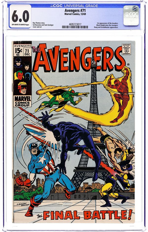 Ends Apr 14 7:40 PM CST Bid History 14 bids Current Bid $106 Your Secret Max Bid If you'd like to bid, please log in or register. "Endgame!" Part 3 of 3. Guest-starring the Invaders (first appearance). Script by Roy Thomas. Pencils by Sal Buscema. Inks by Sam Grainger. Cover by Buscema and Grainger. The Avengers battle the Invaders in 1941 occupied France! Cameo appearances by Ravonna and the original 6th century Black Knight (aka Sir Percy). Notes: The plot of Avengers 71 overlaps with Invaders Annual 1 published eight years later in 1977. The last page is a pin-up featuring the Avengers. Kang returns in Incredible Hulk 135. This is the second appearance of the original Human Torch in Silver Age/Bronze Age continuity. This issue was reprinted in Marvel Super Action 32 and Giant Size (2008) Avengers Invaders. 36 pages. Cover price $0.15.