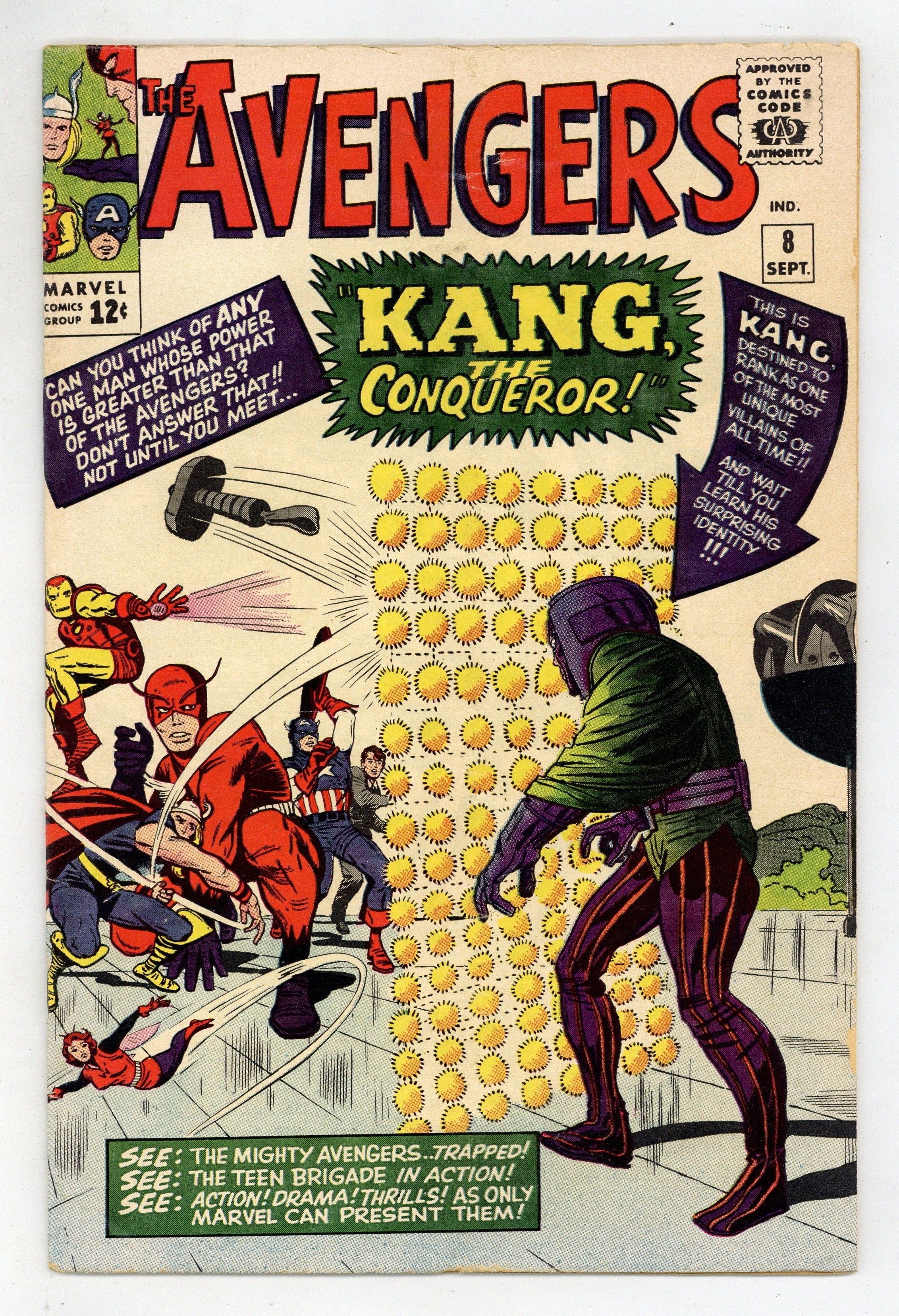 Starts Feb 2 Cover pencils by Jack Kirby, inks by Dick Ayers. Kang, The Conqueror!, script by Stan Lee, pencils by Jack Kirby, inks by Vince Colletta cover; Kang appears and demands to be made ruler of the Earth; The Avengers attempt to stop him, but it comes down to Wasp and the Teen Brigade to slow Kang long enough for the rest of the Avengers to free themselves and put an end to Kang's threat. Roster: Captain America, Thor, Iron Man, Wasp, Giant-Man, and Rick Jones. First appearance of Kang. 36 pgs. $0.12. Cover price $0.12.