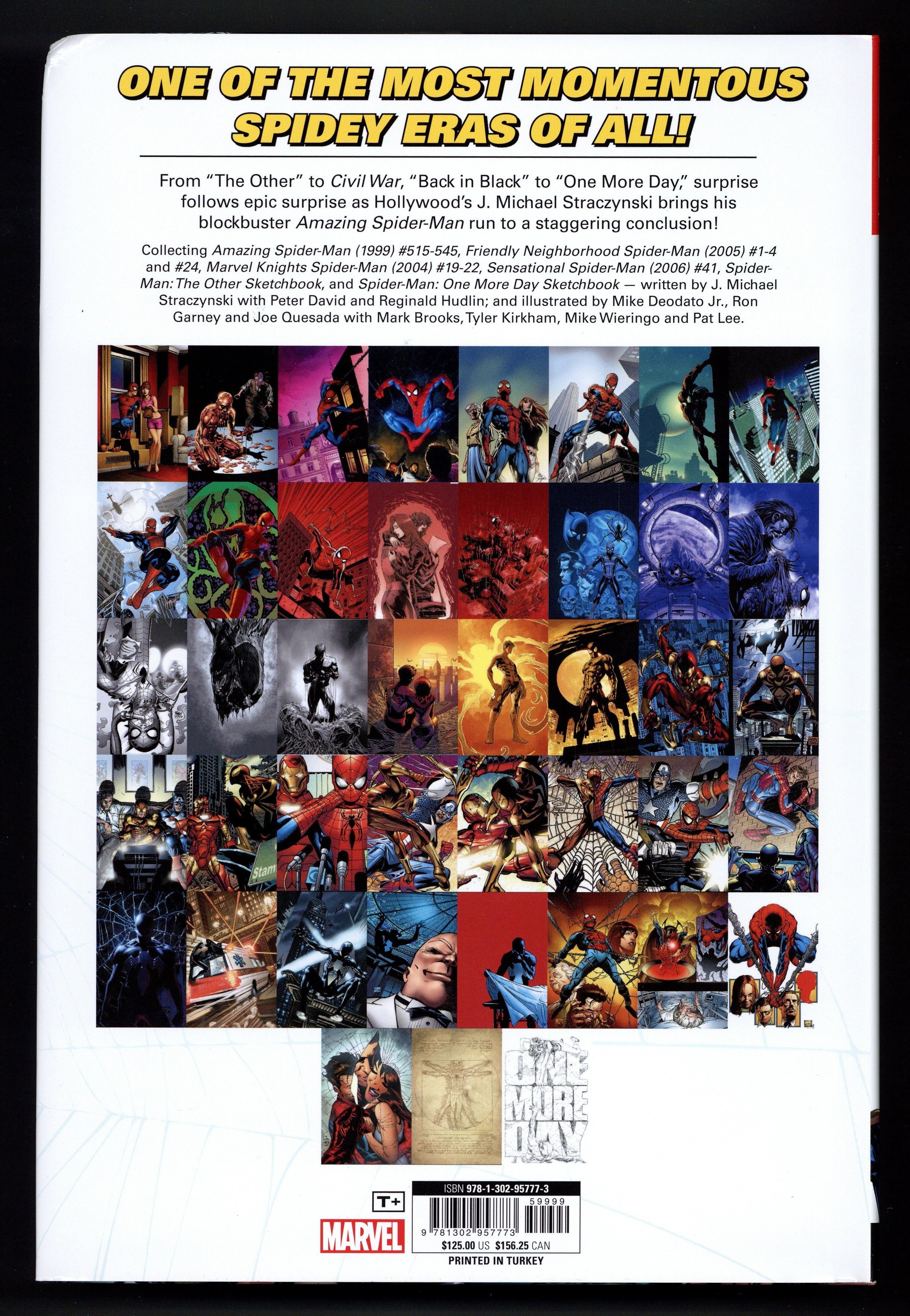 2nd Edition - Volume 1 - 1st printing. Collects The Amazing Spider-Man (1998-2013 2nd Series) #515-545, Friendly Neighborhood Spider-Man (2005-2007) #1-4 and 24, Marvel Knights Spider-Man (2004-2006) #19-22, Sensational Spider-Man (2006 2nd Series) #41, Spider-Man: The Other Sketchbook (2005), and Spider-Man: One More Day Sketchbook (2007). Written by J. Michael Straczynski, Peter David, Reginald Hudlin, and Joe Quesada. Art by Mike Deodato, Jr., Joe Pimentel, Tom Palmer, Mark Brooks, Jaime Mendoza, Mike Wieringo, Karl Kesel, Pat Lee, Tyler Kirkham, Jay Leisten, Sal Regla, Ron Garney, Bill Reinhold, Joe Quesada, Danny Miki, and Dream Engine. Cover by Joe Quesada. J. Michael Straczynski concludes his Amazing run - and everything changes for Spider-Man! First, Spidey gets some new digs - but can he stand living with the New Avengers? In the shocking story line "The Other," the vicious Morlun takes Spider-Man to the brink of death - and beyond! If Peter Parker has any hope of surviving, he has two choices: evolve or die! Then, Civil War erupts - and things really get wild! Spidey in red-and-gold armor! Spidey back in black! And Spidey unmasked in front of the world! But brace yourself for the big finish: As Aunt May lays dying, what would Peter and MJ give for ONE MORE DAY? Hardcover, 8 1/2-in. x 11-in., 1,136 pages, full color. Rated T+ Cover price $125.00.