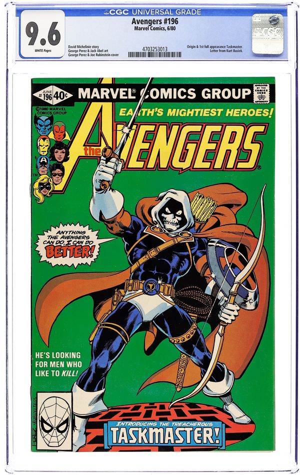 Newsstand Edition. "The Terrible Toll of the Taskmaster" Guest-starring Ant-Man. Script by David Michelinie. Pencils by George Perez. Inks by Jack Abel. Cover by George Perez and Joe Rubinstein. A brand new villain, the Taskmaster, has turned the tables on the Wasp, Yellowjacket, and Ant-Man! The three insect-like super-heroes are prisoners inside the Taskmaster's training academy! The good news is that seven avengers are waiting outside the training compound, but the bad news...none of them know that their teammates are in grave danger! However, Earth Mightiest Heroes follow the ants, and the trail leads to the Taskmaster! Is the villain with the photographic reflexes ready to battle the Avengers? Choose wisely dear Taskmaster! First (full) appearance and origin of the Taskmaster. (Notes: The Taskmaster appears next in Marvel Team-Up 103. The letters page includes a letter from comics writer Kurt Busiek.) 36 pages Cover price $0.40.