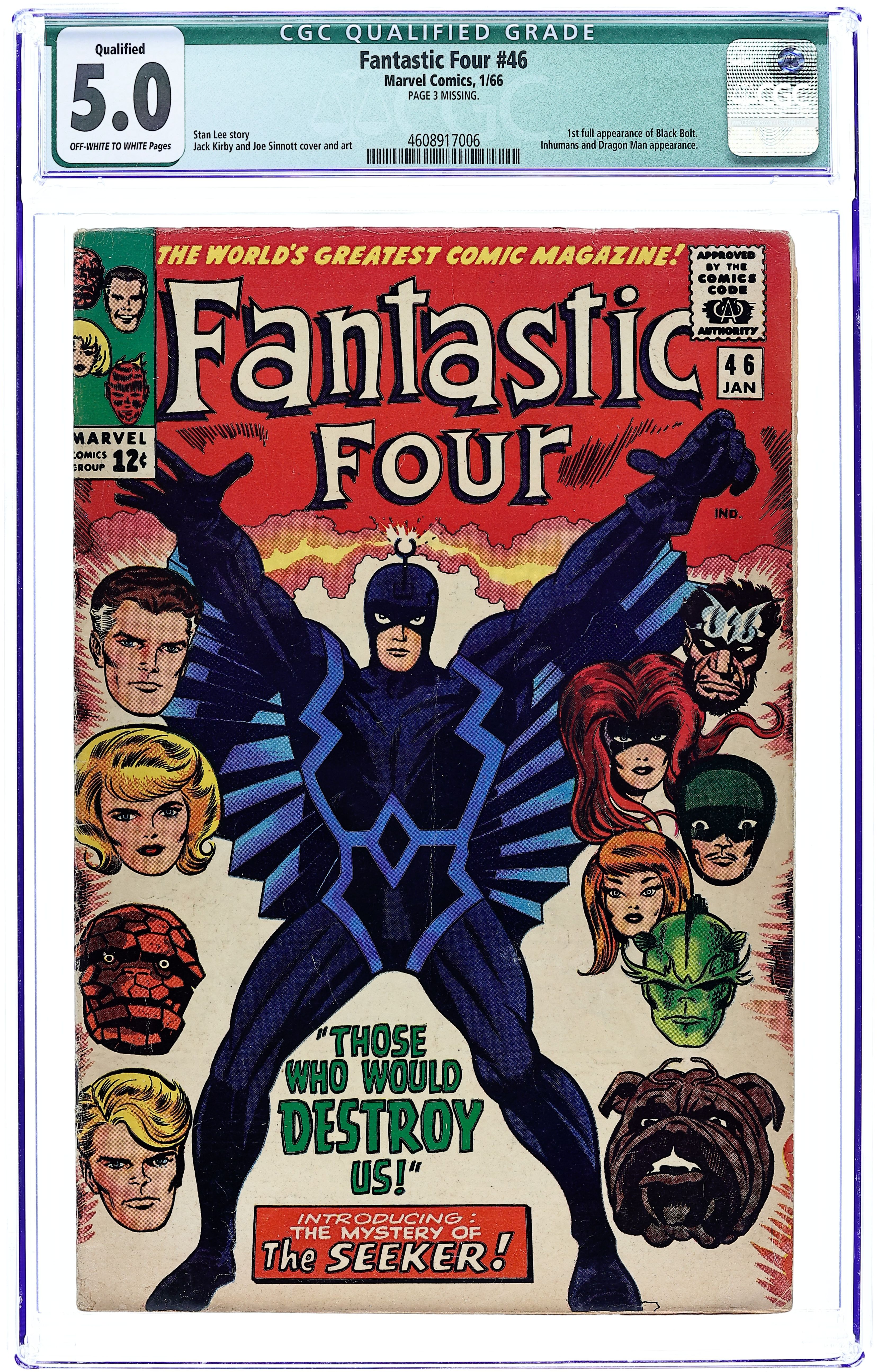 Starts Mar 9 Cover pencils by Jack Kirby, inks by Joe Sinnott. Second appearance of the Inhumans (first Black Bolt cover and full appearance) in Those Who Would Destroy Us!, script by Stan Lee, pencils by Jack Kirby, inks by Joe Sinnott; The FF battle the Inhumans; Triton is captured by the Seeker and the Inhumans teleport away; The FF are captured by the Seeker as they attempt to free Triton. Dragon Man appearance. 36 pgs. $0.12. Cover price $0.12.