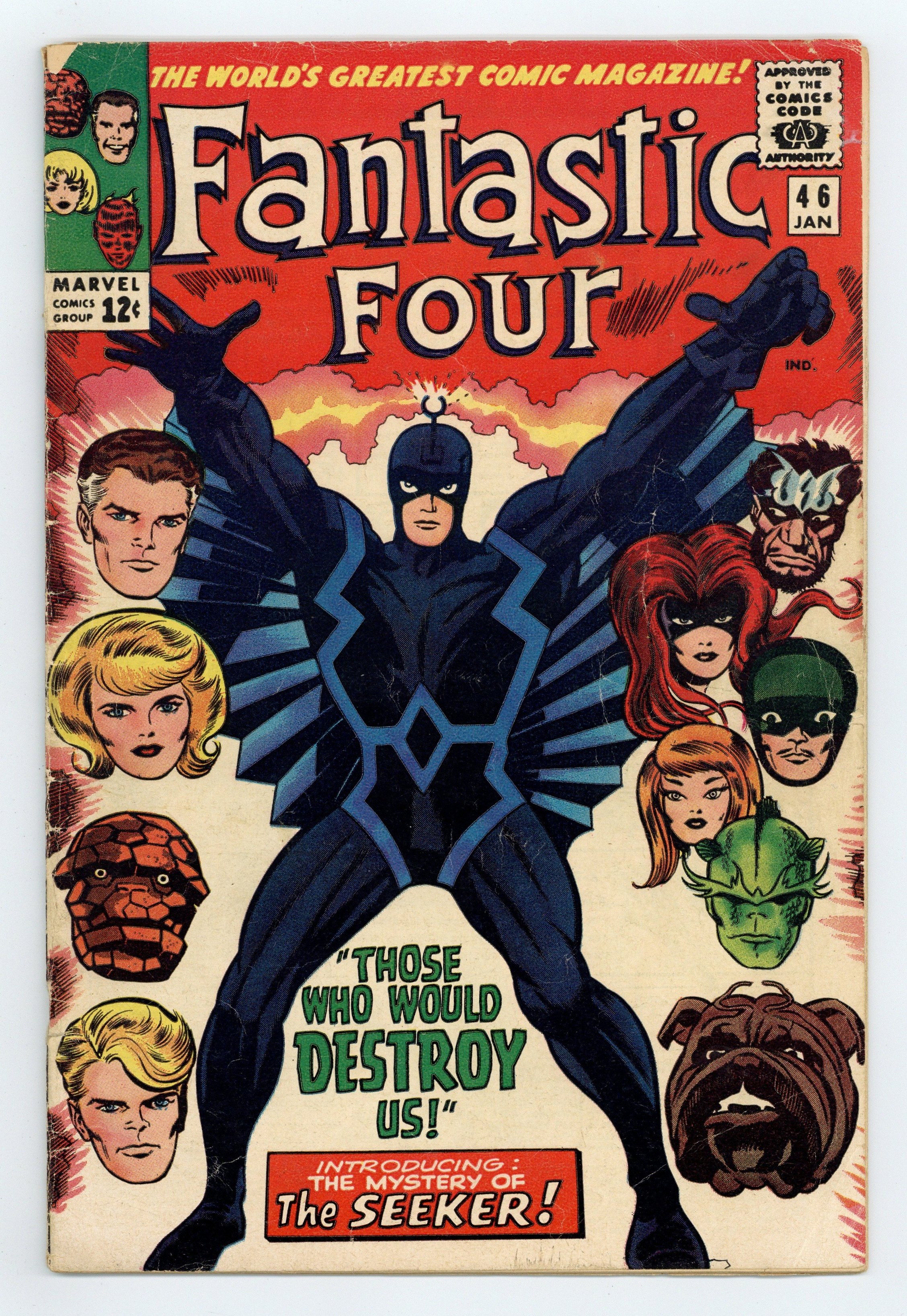 Starts Mar 16 Cover pencils by Jack Kirby, inks by Joe Sinnott. Second appearance of the Inhumans (first Black Bolt cover and full appearance) in Those Who Would Destroy Us!, script by Stan Lee, pencils by Jack Kirby, inks by Joe Sinnott; The FF battle the Inhumans; Triton is captured by the Seeker and the Inhumans teleport away; The FF are captured by the Seeker as they attempt to free Triton. Dragon Man appearance. 36 pgs. $0.12. Cover price $0.12.