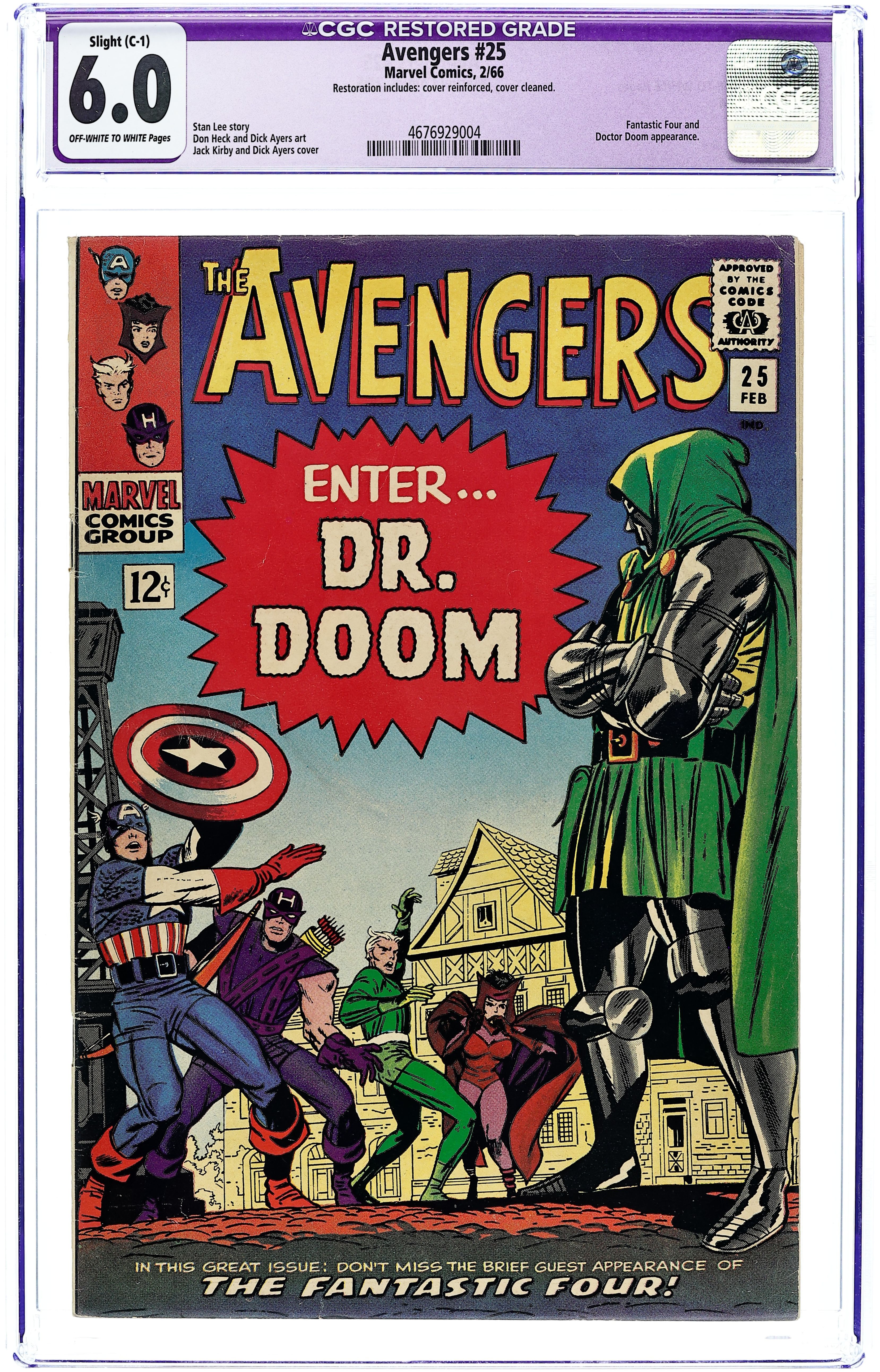 Cover pencils by Jack Kirby, inks by Dick Ayers. "Enter... Dr. Doom!", script by Stan Lee, pencils by Don Heck, inks by Dick Ayers; Scarlet Witch and Quicksilver recieve a letter from their Aunt in Latveria and decide to visit her; When they arrive they are jailed and discover it is a trap set up by Doctor Doom, who decides defeating the Avengers will instill fear in to the Fantastic Four,making them easy to defeat; The Fantastic Four attempt to assist the Avengers, but are not allowed, as interference could spark an international incident; Nevertheless, the Avengers escape and fight Doom to a standstill, where he causes a diversion and escapes. Avengers roll call: Captain America, Hawkeye, Quicksilver, and the Scarlet Witch. Guest appearance by the Fantastic Four. Letter to the editor from writer Steve Utley. Reprinted in Marvel Triple Action #19. 36 pgs., full color. $0.12. Cover price $0.12.