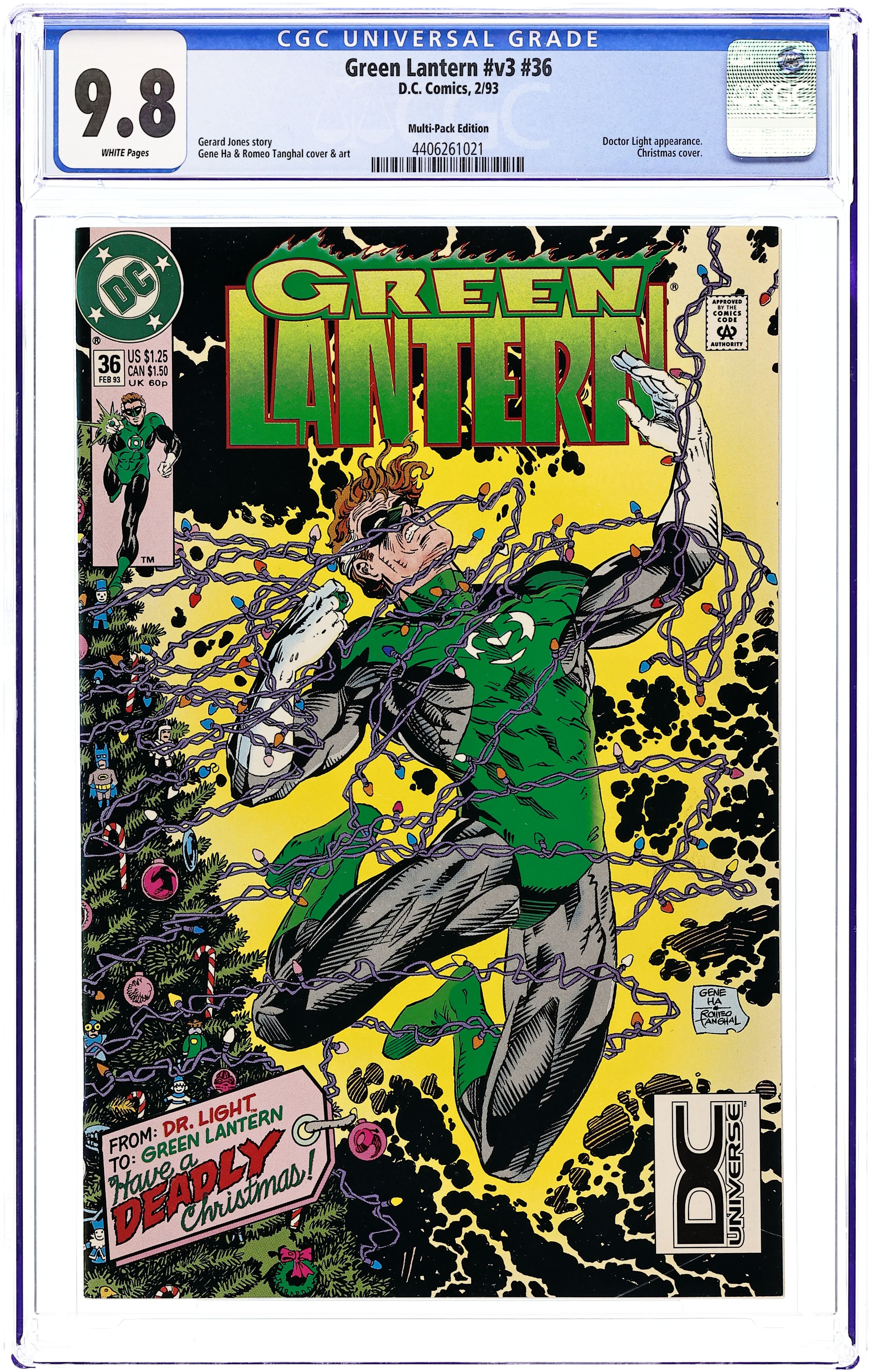 DC Universe UPC Multi-Pack Edition. Christmas Issue. "The Ghost of Christmas Light!" Story by Gerard Jones and Joe Filice. Art by Gen Ha and Romeo Tanghal. In this special Holiday issue, Hal brings Carol home to meet his folks. However, the Yule Tide spirit may be dimmed when the nefarious Doctor Light shows up seeking Green Lantern's power source. Cover price $1.25.
