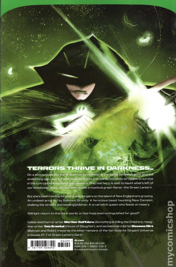 Written by Tate Brombal. Art by Werther Dell Edera. Cover by Werther Dell Edera. On a post-apocalyptic Earth overrun by monsters, the battle between good and evil ended long ago--and evil won. Now darkness prevails as humanity struggles to survive in the corrupted wasteland that remains. Only one hero is said to haunt what's left of our shadowed cities, the one who wields the mystical green flame that could return light to a dark world--The Green Lantern. But she's been missing for years, and on the isolated island of New England, Solomon Grundy's undead army only grows larger and more powerful every night... Celebrated horror artist of smash hit Something is Killing the Children Werther Dell'Edera teams with rising-star writer Tate Brombal (House of Slaughter) to bring you a chilling tale of desperation, hope, and resurrection from the bitter remains of the fan-favorite Tangent Universe! 52 pages, full color. Rated T+ Cover price $4.99.