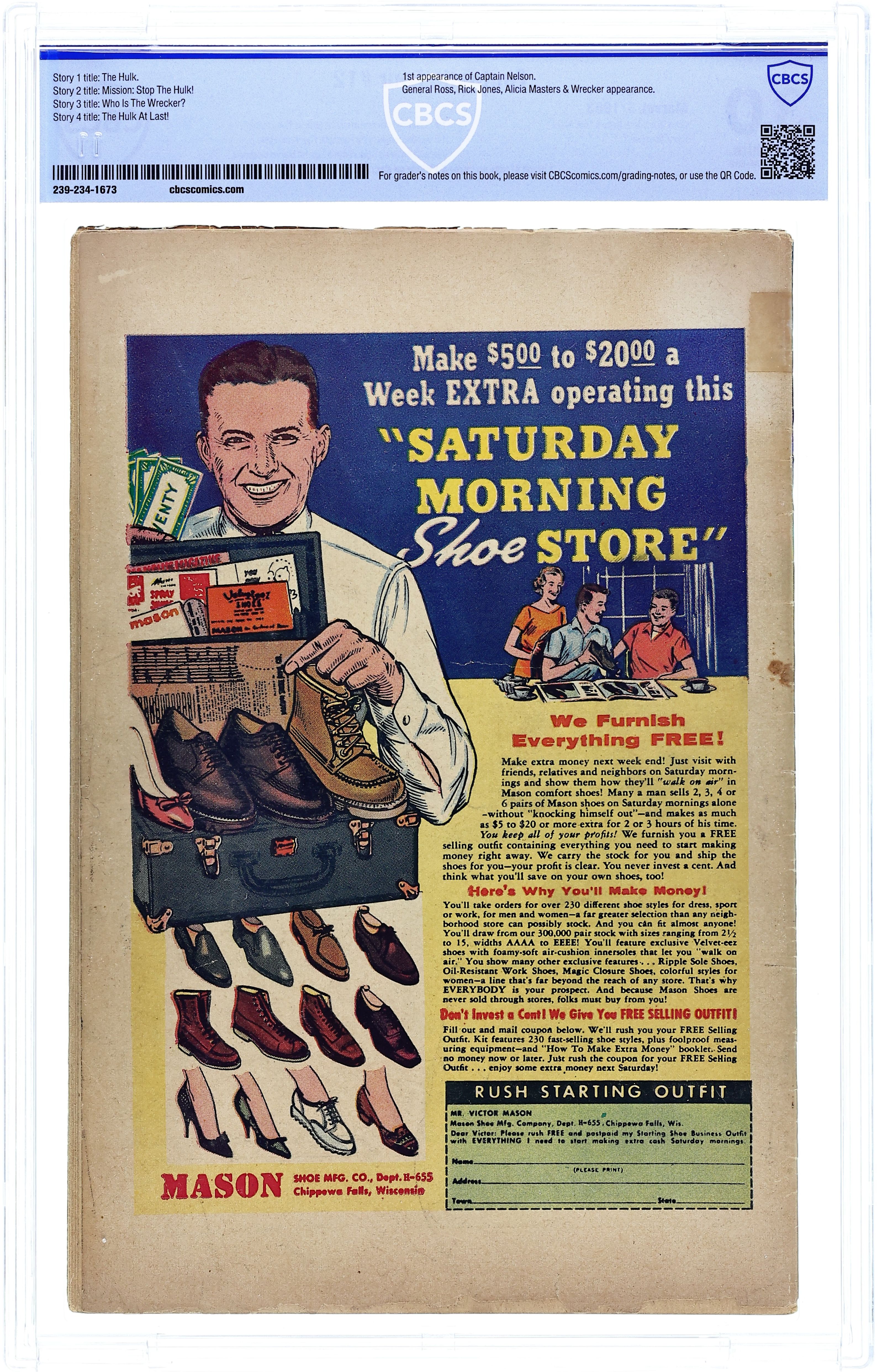 Cover pencils by Jack Kirby, inks by Dick Ayers. The Incredible Hulk, script by Stan Lee, pencils by Jack Kirby, inks by Dick Ayers; General Ross asks the Fantastic Four "to find and destroy the Hulk". His base was victim of a saboteur and Hulk is the only suspect. Part 2 Mission: Stop the Hulk!; The Fantastic Four goes to a briefing at the base in New-Mexico; There, they meet Bruce Banner and his assistant, Karl Kort, to discuss how to stop the Hulk. Part 3 Who Is the Wrecker?; Rick Jones identifies Karl Kort as the saboteur. Part 4 "The Hulk ar Last!"; Karl Kort brings Rick in caves where Hulk and the Fantastic Four are searching for him. 36 pgs. $0.12. Cover price $0.12.