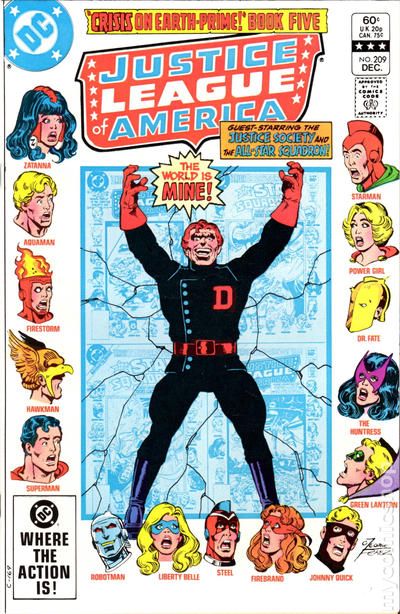 Newsstand Edition. A Thunderbolt berserk in "Crisis in the Thunderbolt Dimension!" Guest-starring the all-star Justice Society! Continued next issue. Written by Roy Thomas and Gerry Conway, with art by Chuck Patton and Romeo Tanghal. Characters: Flash [Barry Allen]; Black Canary; Green Arrow [Hal Jordan]; Red Tornado; Zatanna; Elongated Man; Firestorm; Batman [Earth-1] (flashback); Atom [Ray Palmer] (flashback); Hawkman [Katar Hol] (flashback); Superman [Earth-1] (all as the Justice League of America/JLA); Huntress [Helena Wayne]; Dr. Mid-Nite (flashback); Superman [Earth-2] (flashback); Power Girl; Starman [Ted Knight]; Hourman [Rex Tyler] Flash [Jay Garrick]; Johnny Thunder's Thunderbolt (all as the Justice Society of America/JSA); Fiddler; Chronos; Dr. Alchemy; Icicle; The Wizard; Felix Faust; Aquarius (flashback); Johnny Thunder [Earth-1] (villain); Black Canary [Dinah Lance]. Cover by George Perez. Cover price $0.60.