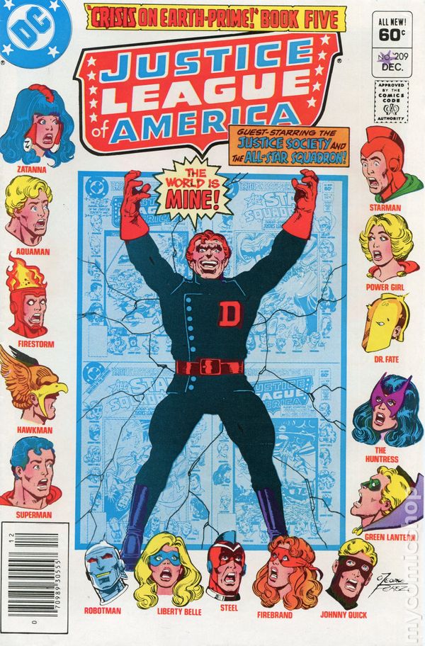 Direct Edition. A Thunderbolt berserk in "Crisis in the Thunderbolt Dimension!" Guest-starring the all-star Justice Society! Continued next issue. Written by Roy Thomas and Gerry Conway, with art by Chuck Patton and Romeo Tanghal. Characters: Flash [Barry Allen]; Black Canary; Green Arrow [Hal Jordan]; Red Tornado; Zatanna; Elongated Man; Firestorm; Batman [Earth-1] (flashback); Atom [Ray Palmer] (flashback); Hawkman [Katar Hol] (flashback); Superman [Earth-1] (all as the Justice League of America/JLA); Huntress [Helena Wayne]; Dr. Mid-Nite (flashback); Superman [Earth-2] (flashback); Power Girl; Starman [Ted Knight]; Hourman [Rex Tyler] Flash [Jay Garrick]; Johnny Thunder's Thunderbolt (all as the Justice Society of America/JSA); Fiddler; Chronos; Dr. Alchemy; Icicle; The Wizard; Felix Faust; Aquarius (flashback); Johnny Thunder [Earth-1] (villain); Black Canary [Dinah Lance]. Cover by George Perez. Cover price $0.60.