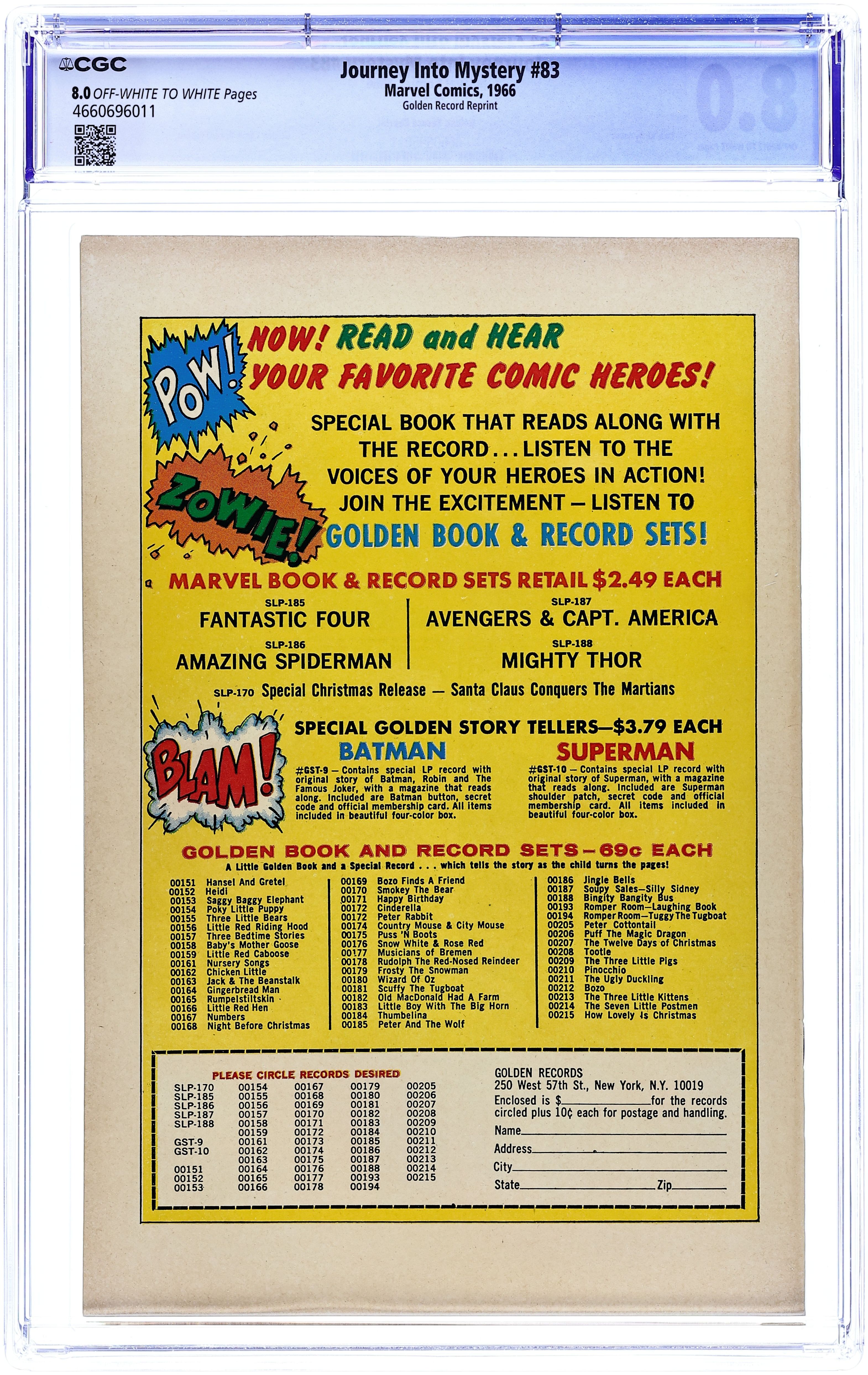 COMIC ONLY, NO RECORD - Reprint from the Golden Record Comic set. Near exact replica of J.I.M (Thor) # 83, but there is no cover price or issue # and Golden Record ad on back cover. 83A does not include the record.