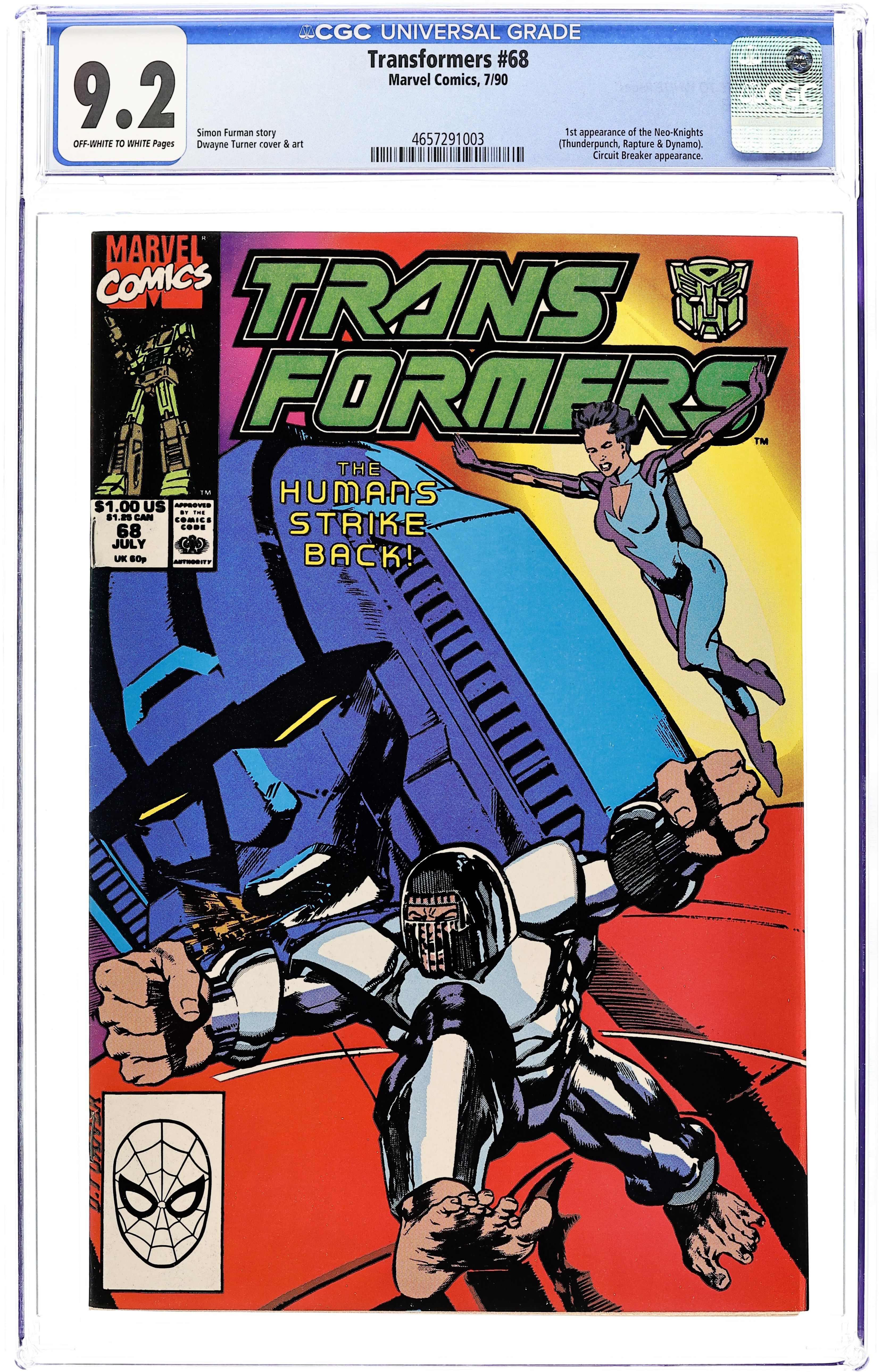 Direct Edition. G.B. Blackrock recruits mutants and super-humans to fight the Decepticons. It's the debut of the first superteam in the Transformers Universe in "The Human Factor!" Written by Simon Furman, with art by Dwayne Turner. Cover price $1.00.