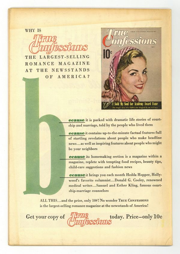 $39.00Stories and art by Alice Kirkpatrick and Sam Citron. Ziff-Davis published the first incarnation of this influential romance title. Beautiful war refugee Wanda is aided by talent agent Rick, but she's not sure if he's interested in her, or just her star potential, in a story with art by pioneering female comics artist Alice Kirkpatrick. Ann is romanced by handsome Antonio while attending Mardi Gras in Rio de Janeiro... but can it last? Waitress Joanne gets the chance to impersonate a debutante, but she didn't expect to find love at the same time. Claimed by the Past; Mardi Gras Sweetheart; I'll Find My Love; This Man Is Mine; Dreams and Deceptions. Final issue published by Ziff-Davis; St. John picked up the series a year later. 32 pages, Full Color. Cover price $0.10.