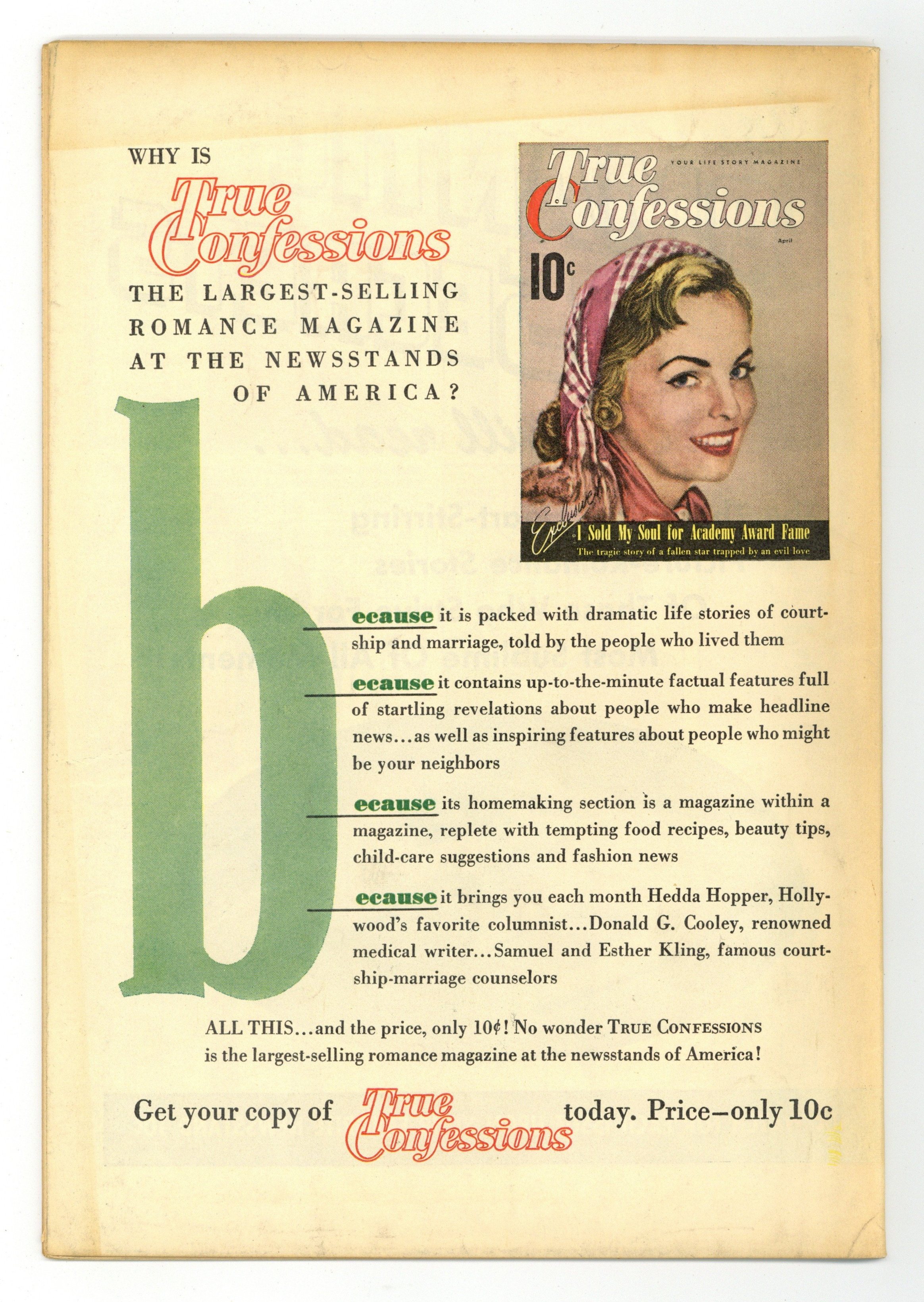 Photo cover. In order of appearance: "Two Weeks with Love" reprinted in Real Love (1949-56 Ace) #76; "Out of Her Class"; "Uncertain Heart" reprinted in Love Experiences (1949) #38; and "Behind His Proposal" reprinted in Glamorous Romances (1949) #90. "For a More Glamorous You: The Art of Being Feminine, Your Most Glamorous Self, For Lovelier Legs..." text article reprinted as "Help Yourself to Allure..." in Love Experiences (1949) #18 and as "Glamorize Yourself..." in Glamorous Romances (1949) #79, partially reprinted from "For Beauty's Sake..." in Revealing Romances (1949) #5 and from "Glamorizing Yourself..." in Glamorous Romances (1949) #65, and partially reprinted in "The Charm Corner..." in Real Love (1949-56 Ace) #59, "Enhance Your Appearance..." in Ten Story Love Vol. 33 (1954) #3, and "Bring Out Your Best..." in Ten Story Love Vol. 36 (1955) #2. 36 pages. Full color. Cover price $0.10.
