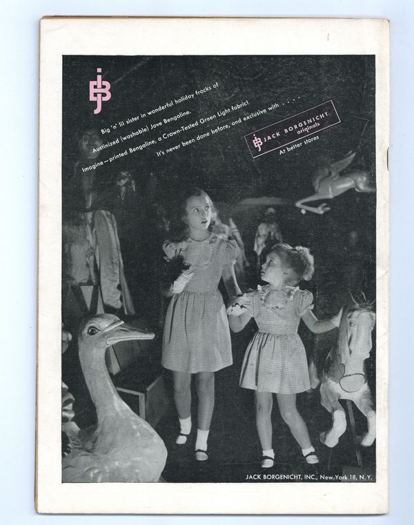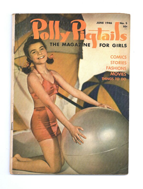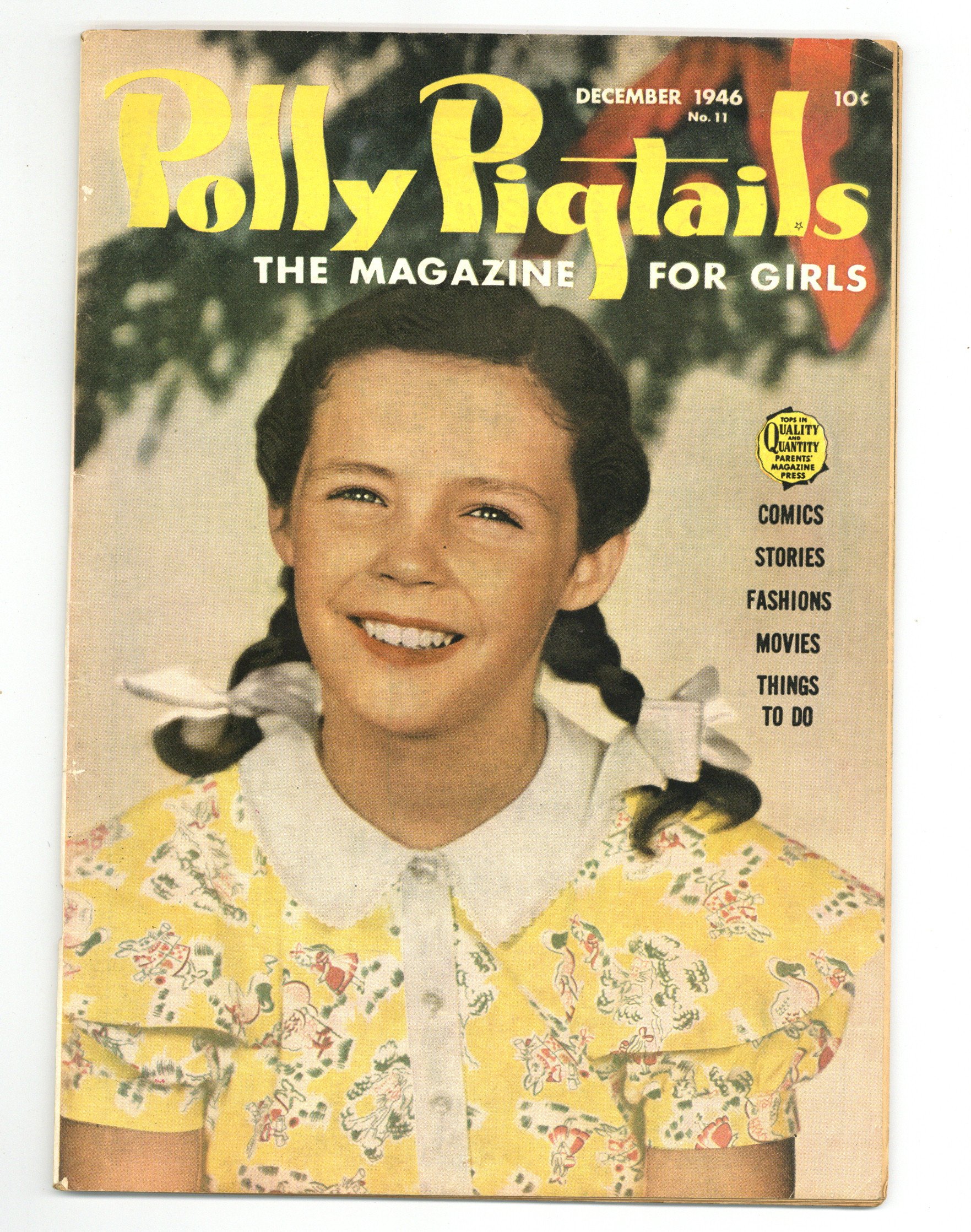 Published Dec 1946 by Parents' Magazine.$27.00Cover photo by Genevieve Naylor. Stories and art by Margaret Bland, Regina Kohrman, Helen Carter Maxon, Doris Falk, Ann Williams-Heller, Carol Robb, Laura Leahart, Lynne Smith, Nancy Williams and Alice Barr Grayson. A magazine for girls from the producers of Parents' Magazine, with stories, fashion and advice as well as comics. A teacher overhears the Pigtail Club's low opinion of her; A comics biography of designer Lilly Dache, who becomes famous for her upscale hats. Also featuring a vintage ad for Margaret O'Brien earmuffs ("Girls - They're Ear-resistible!") featuring the young movie star. The Pigtail Club; Cleopatra and the Nineteen Tunnels; Twinkle Is a Star; March of the Mannequins; The Different One; The Merry Hatter; The Real North Pole; Recipe for a Merry Christmas Party; Hobbies; Holiday Acrostic; Skating Glitter; The Secret of the Deserted Town; It's Sew Easy; Polly Prefers; Christmas Stocking Stuff; Fun With Fashion; Sleeping Beauty; Under Polly's Tree; Have You Troubles?; Polly in the Kitchen. 56 pages, Full Color. Cover price $0.10.