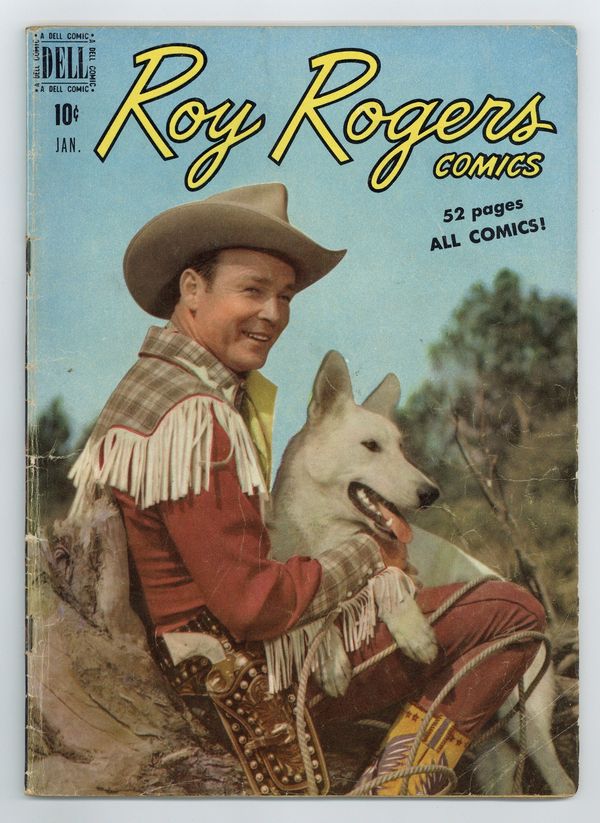 Photo covers of the famous singing cowboy, plus interior photos. Roy Rogers and the Lady Marshal, art by Albert Micale and Randy Steffen; Roy locks horns with a lady peace officer. Roy Rogers Trades Lead, art by Al McKimson and Randy Steffen; Roy goes searching in rugged country for a man's lost son. Pioneers of the Old West story, script by Gaylord DuBois, art by Albert Micale. Trigger story, script by Gaylord DuBois, art by Harry Parks. Back cover: color photo of Roy standing at fence, back to camera. 52 pages, full color. Cover price $0.10.