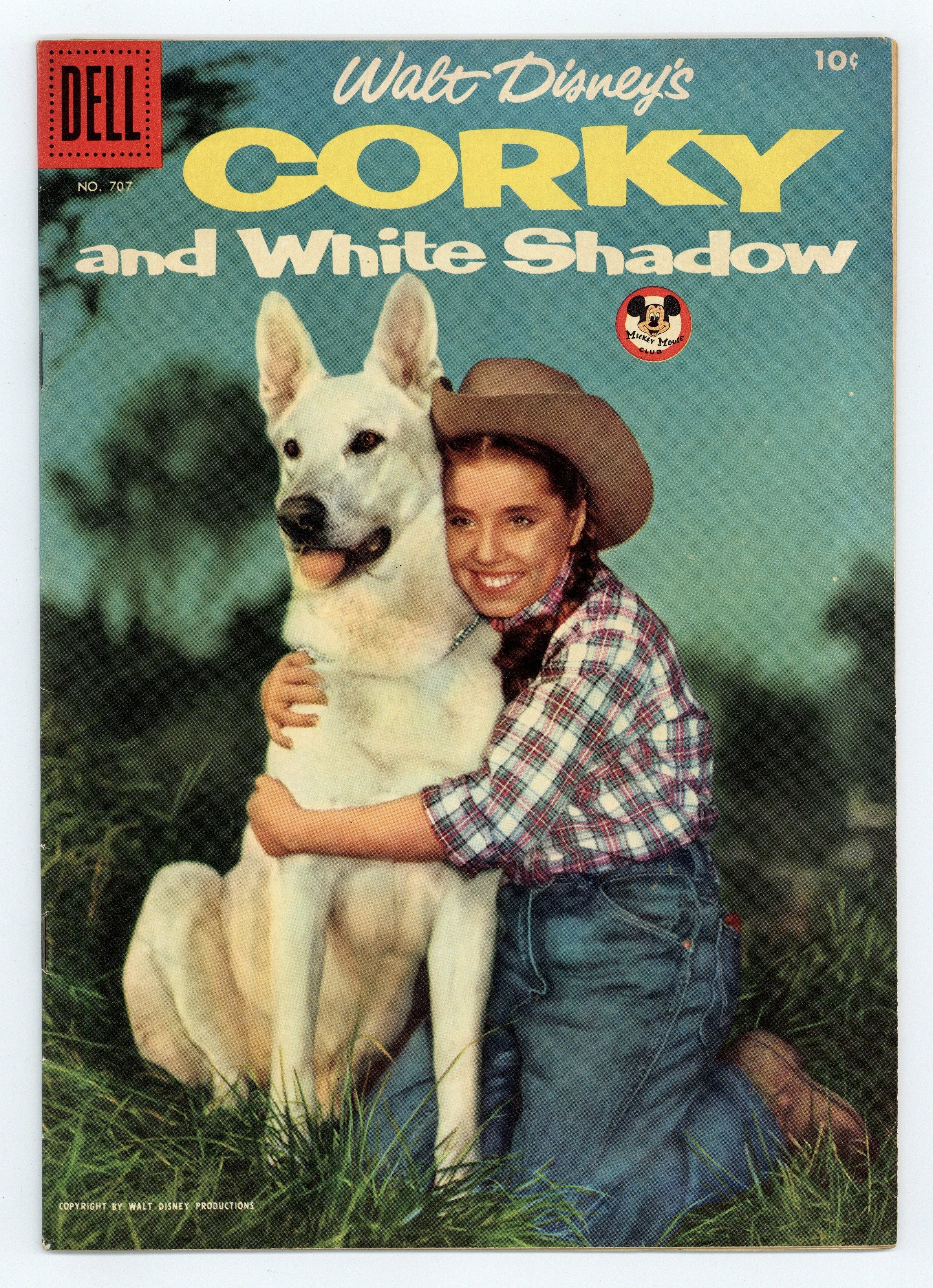$16.00Indicia title is "Walt Disney's CORKY AND WHITE SHADOW, No. 707." Cover photo of Corky (as played by Darlene Gillespie) and White Shadow (as played by Chinook). Preview of the story with photo. Corky and White Shadow, art by Dan Spiegle; A young girl and her dog, in the West, help her sheriff father capture a pair of bank robbers. Adapted from a serial originally presented on the "Mickey Mouse Club" TV series in 1956. First Disney comic to be illustrated by Dan Spiegle. 36 pages, full color. Cover price $0.10.