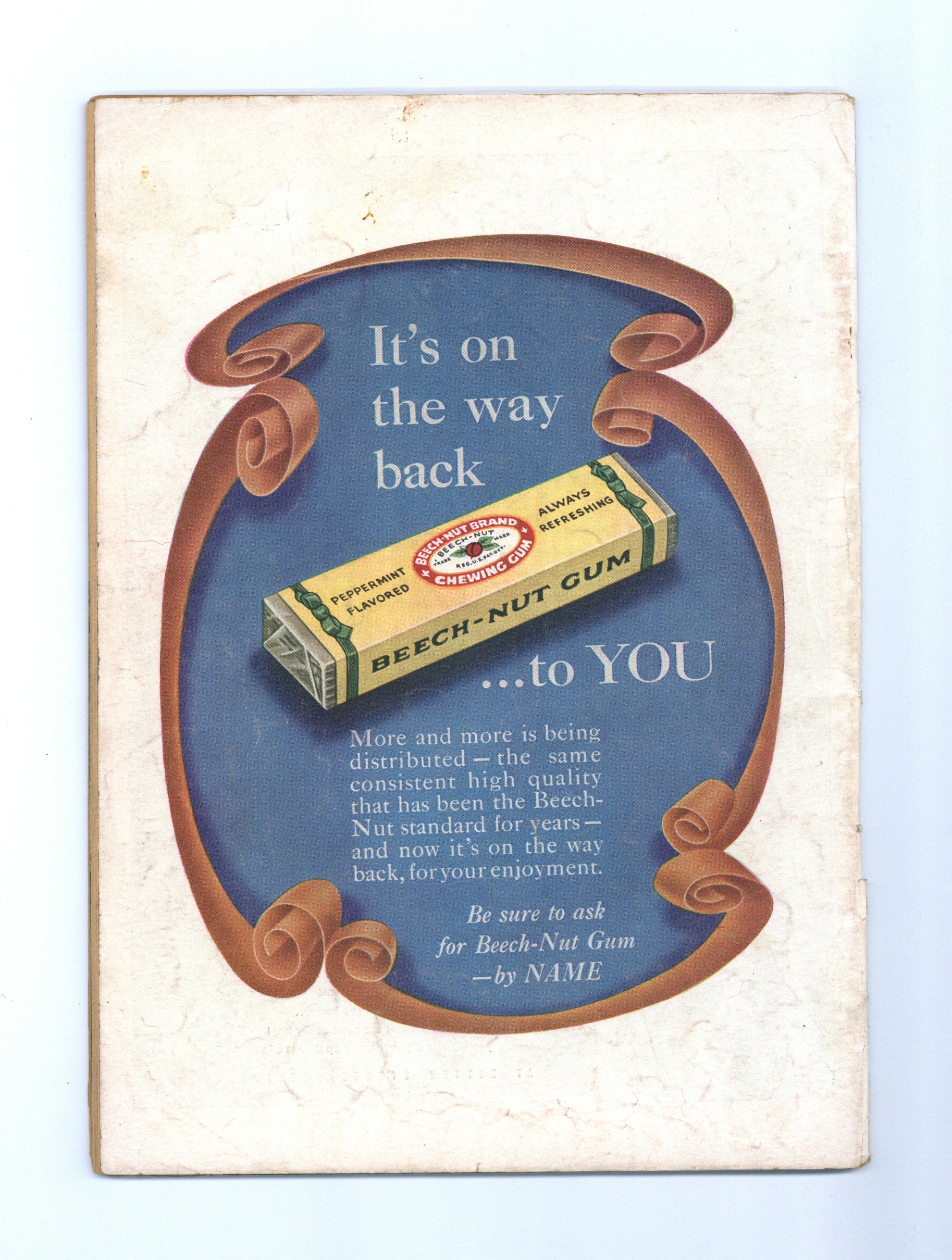 Silent-movie cowboy Tom Mix became a pop-culture icon with his 1940s radio show and this tie-in comic. When rustled cattle vanish without a trace, the cowboys suspect ghosts, but Tom's not so sure. In a two-part story, Tom realizes that outlaws are using his own ranch as a place to store stolen weapons, because who would suspect Tom Mix's ranch? Tom races to rescue a professor who has been abducted by spies. Unlucky Harry; The Dobie Spy Scare; Saddlehead; Pinto Pete; The Rustler's Ghost; Lost In the Night: Chapter 1: The Hide-Out!; Jeeter and His Talking Horse Preposterous: Batter, Butter or Butter Batter; Chapter 2: The Mountain Escapade. Final issue of the series. 32 pages, Full Color. Cover price $0.10.