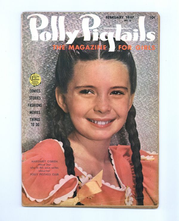 Stories and art by John Scott Douglas, Ruth K. Kent, Maurine Wills, Lois Withers, Maureen Clawsey, Margaret O'Brien, Carol Robb, Laura Leahart, and Marie Cummings. A magazine for girls from the producers of Parents' Magazine, with stories, fashion and advice as well as comics. A visit with teen actress Margaret O'Brien on the set of the classic film Tenth Avenue Angel; Photos of O'Brien and a feature written by the actress herself; Tizzie tries to direct the school play when the teacher is out sick. The Pigtail Club; Wings of the Wind; Movie in the Making; Family Surprise; Tizzie the Genius; Five Tricks for Better Pix; Humpty Dumpty Habits; Sidewalk Show; Hobbies; Designed by a Pigtail Professional; Pablum Pals; The Mystery of the Old Ruins; It's Sew Easy; A Party for Your Valentine; Polly Pigtails in Hollywood; Fun With Fashion; Valentine Barrette; Club News; Have You Troubles?; Polly in the Kitchen. 48 pages, Full Color. Cover price $0.10.