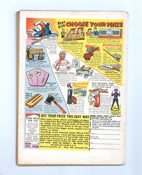 Stories and art by Edmond Good and Leonard Frank. Movie cowboy Monte Hale wanders the frontier, cleaning up the West one outlaw at a time. Monte's old enemy, proto-Goth gunslinger The Gravedigger, escapes from prison by faking his own death and sets out for revenge. A calico horse holds the clue to an outlaw gang's hideout, but Monte isn't sure just how. Monte agrees to ride in a friend's rodeo to replace fired Vance and his deadly albino horse Lightning, but Vance isn't happy about that. Plus vintage comics-format ads for RC Cola, Popsicle, and Dubble Bubble. The Grave-Digger's Web; The Rodeo Menace; Disputed Empire; Boisterous Buster; Gray Hawk: Ride the Iron Horse; Gabby Hayes: Gabby's Big Blast; Old Slick; Bronko Betsy; Monte Hale's Cowboy Songs: When the Work's All Done This Fall; The Mystery of the Calico Horse. 32 pages, Full Color. Cover price $0.10.