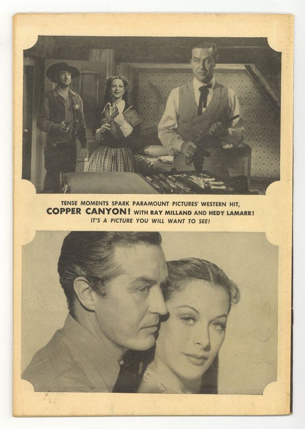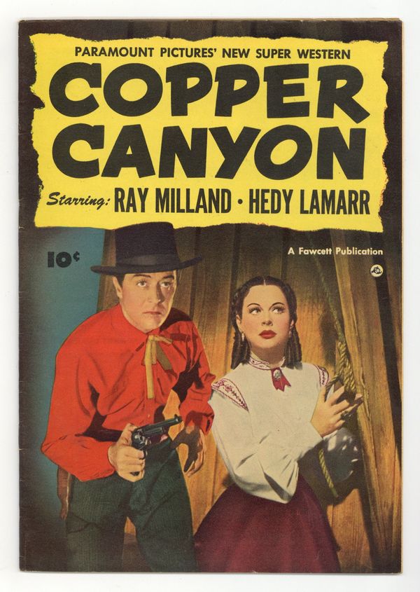 Photo cover features Ray Milland and Hedy Lamarr. Story by Joe Millard, from the screenplay by Jonathan Latimer. Art by Clem Weisbecker and Sheldon Moldoff. Fawcett presents adaptations of popular movies of the 1950s in comics form. This issue is based on the 1950 Paramount Western, Copper Canyon. In the years after the Civil War, tensions remain high between Northern and ex-Confederate settlers making a new life on the Nevada frontier. Trick-shooter Johnny tries to keep the peace without resorting to violence. Plus photo stills from the film. 32 pages, Full Color. Cover price $0.10.