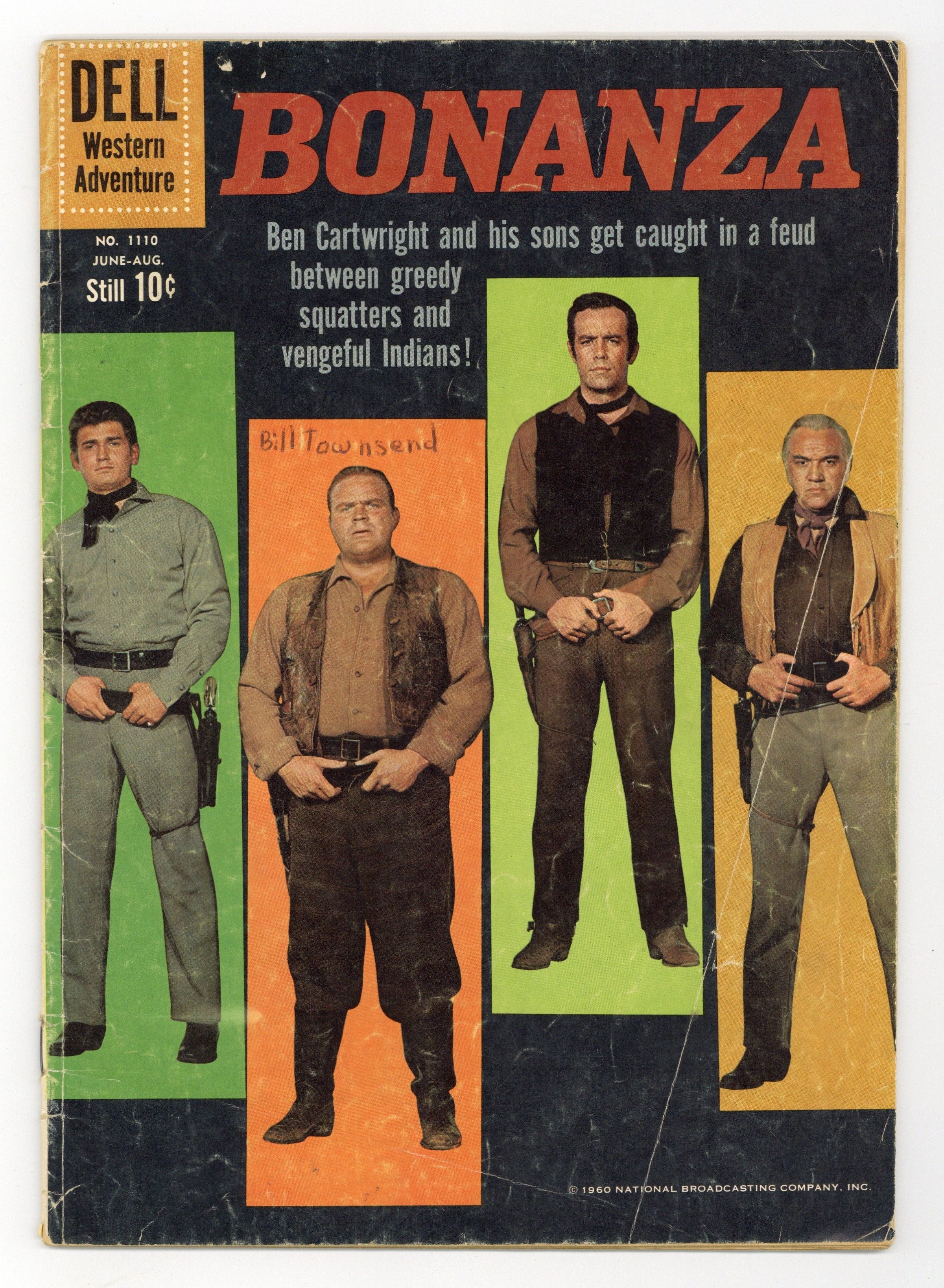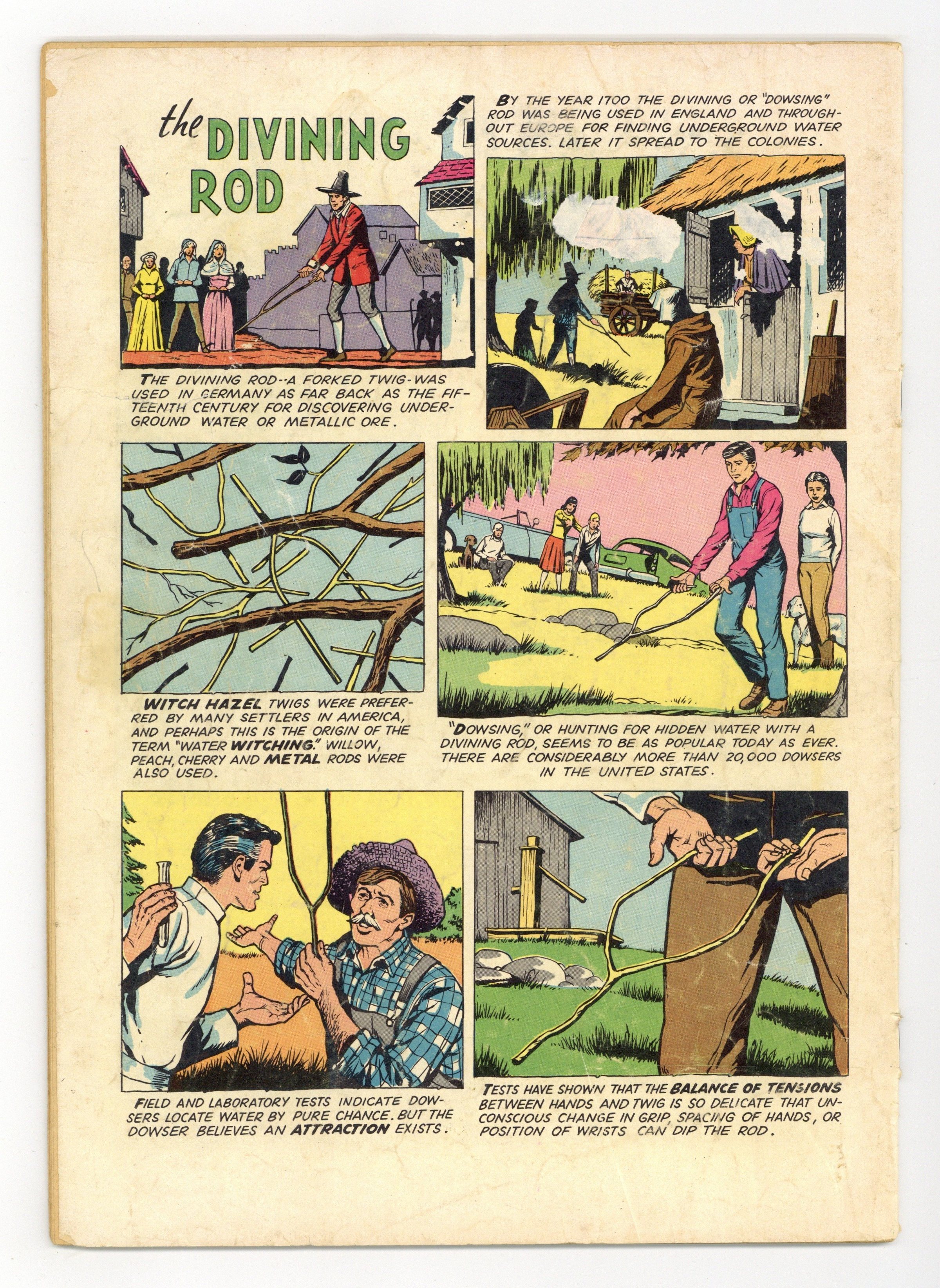 "The Divining Rod" back cover variant. Indicia title is "BONANZA, No. 1110." Photo cover of Adam Cartwright (as played by Pernell Roberts), Little Joe Cartwright (as played by Michael Landon), Hoss Cartwright (as played by Dan Blocker), and Ben Cartwright (as played by Lorne Greene). The Ponderosa Ranch; The Cartwrights get caught between arrogant squatters and vengeful Indians and have to prevent a range war. The Gold Dowser; A professor claims to be able to find water or gold by dowsing with a forked stick. The XIT Ranch fact page; History of the XIT Ranch in Texas. The Divining Rod fact page; use of divining rods to find water. Scripts by Gaylord Du Bois, art by Tom Gill. 36 pages, full color. Cover price $0.10.