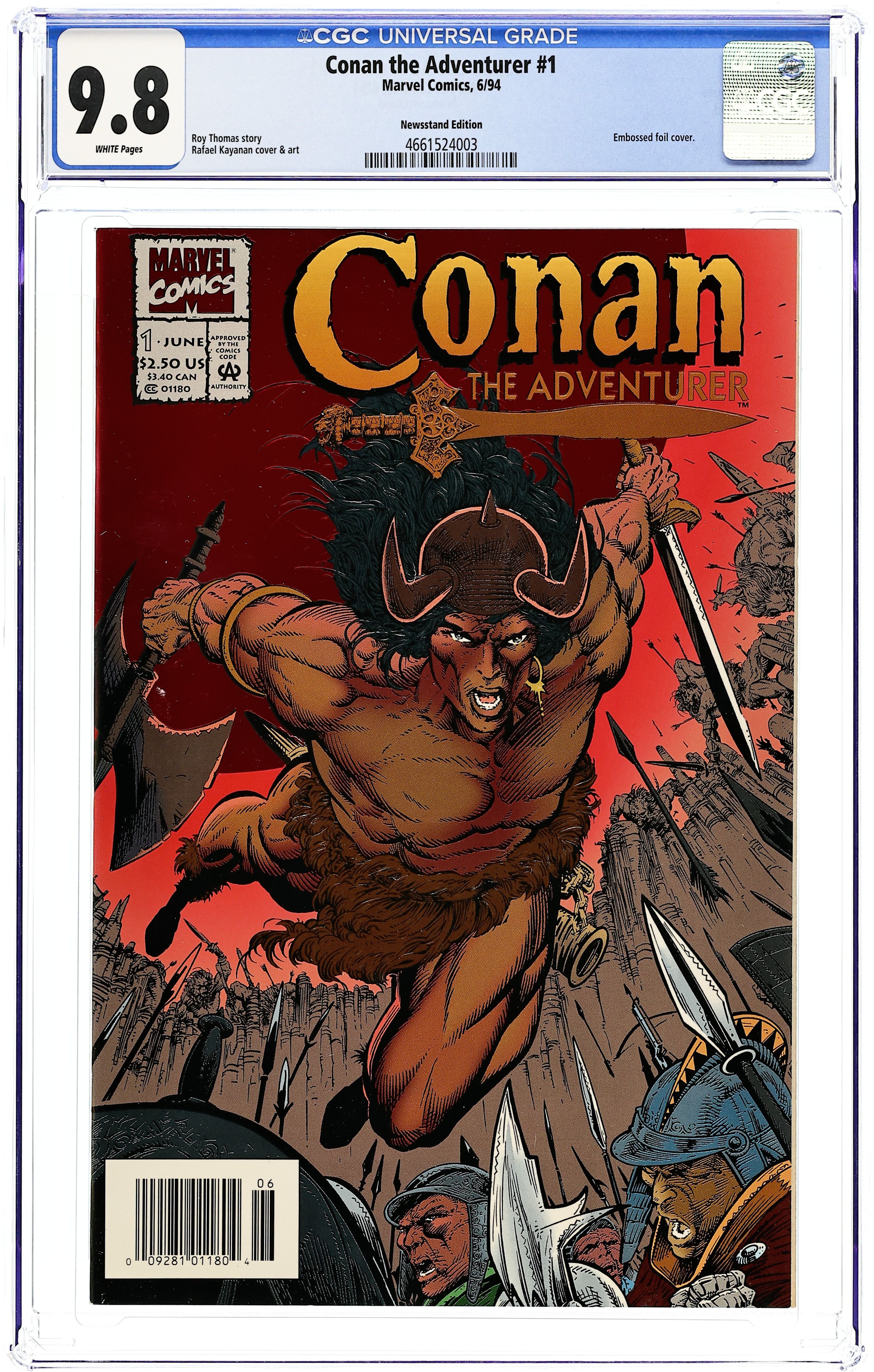 Newsstand Edition. Embossed card stock cover. Cover art by Rafael Kayanan. Barbarians at the Gate!, script by Roy Thomas, art by Rafael Kayanan; Tells how Conan and other Cimmerians conquered the Aquilonian outpost of Venarium. 36 pgs. $2.50. Cover price $2.50.