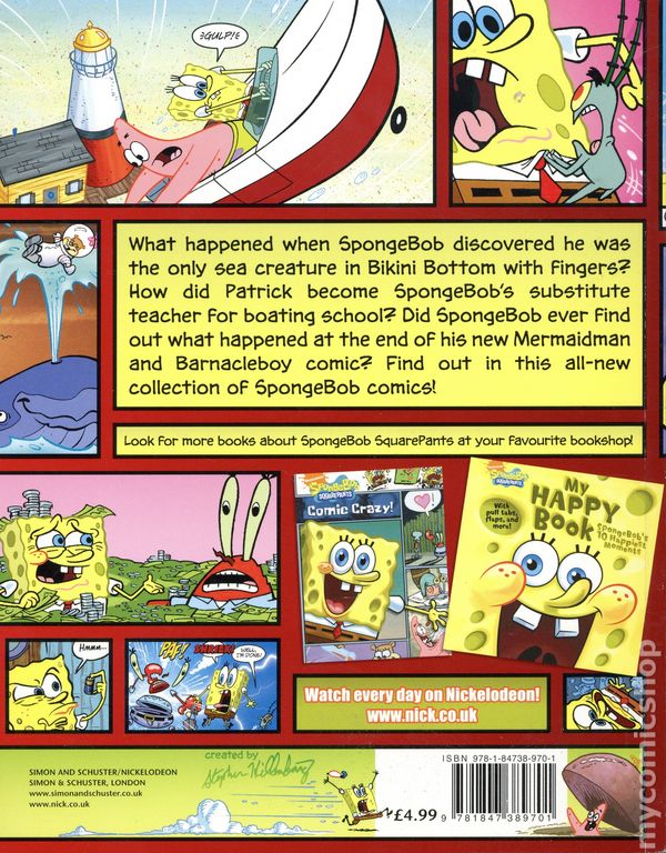 2nd and later printings. What happened when SpongeBob discovered he was the only sea creature in Bikini Bottom with fingers? How did Patrick become SpongeBob's substitute teacher for boating school? Did SpongeBob ever find out what happened at the end of his Mermaidman and Barnacleboy comic? Find out in this all-new collection of SPongeBob comics! Collects Spongebob Squarepants comics by Ramona Fradon, David Lewman, Gregg Schigiel, and many others. Softcover, 7-in. x 9-in., 64 pages, full color.