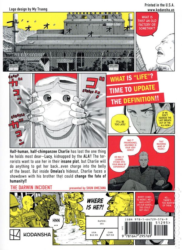 Volume 9 - 1st printing. Story and art by Shun Umezawa. Translated by Cat Anderson. Anime adaptation recently announced! This award-winning series marries a unique sci-fi set-up with an examination of social issues surrounding veganism, animal exploitation, and ecoterrorism. What is "life"? Time to update the definition!! Half-human, half-chimpanzee Charlie has lost the one thing he holds most dear—Lucy, kidnapped by the ALA!! The terrorists want to use her in their insane plot, but Charlie will do anything to get her back...even charge into the belly of the beast. But inside Omelas's hideout, Charlie faces a showdown with his brother that could change the fate of humanity!! Softcover, 5-in. x 7-in., 160 pages, B&W. Mature Readers Cover price $12.95.