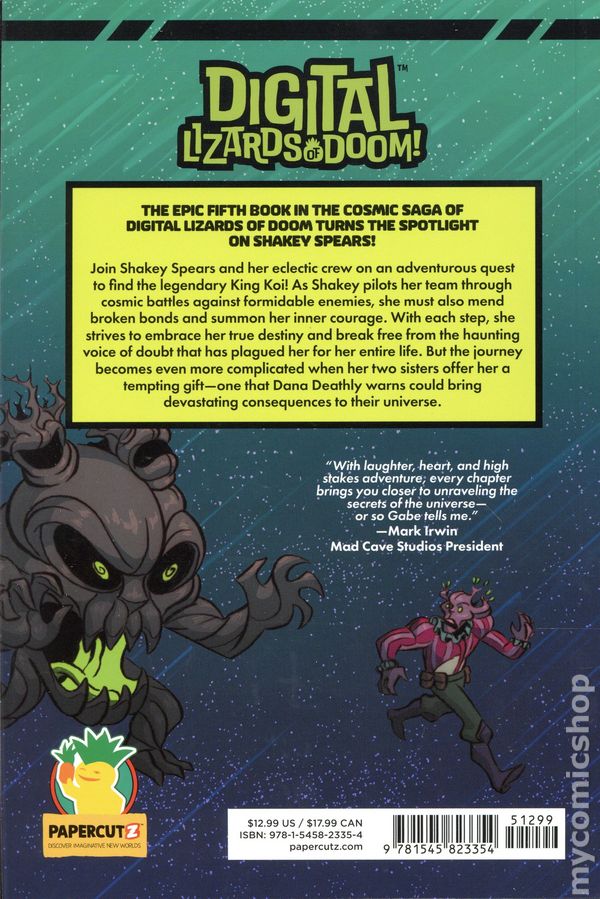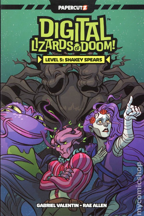 Volume 5 - 1st printing. "Level 5: Shakey Spears!" Written by Gabriel Valentin. Art and cover by Rae Allen. Join Shakey Spears and her eclectic crew on an adventurous quest to find the legendary King Koi! As Shakey pilots her team through cosmic battles against formidable enemies, she must also mend broken bonds and summon her inner courage. With each step, she strives to embrace her true destiny and break free from the haunting voice of doubt that has plagued her her entire life. But the journey becomes even more complicated when her two sisters offer her a tempting gift—one that Dana Deathly warns could bring devastating consequences to their universe. Softcover, 160 pages, full color. Cover price $12.99.