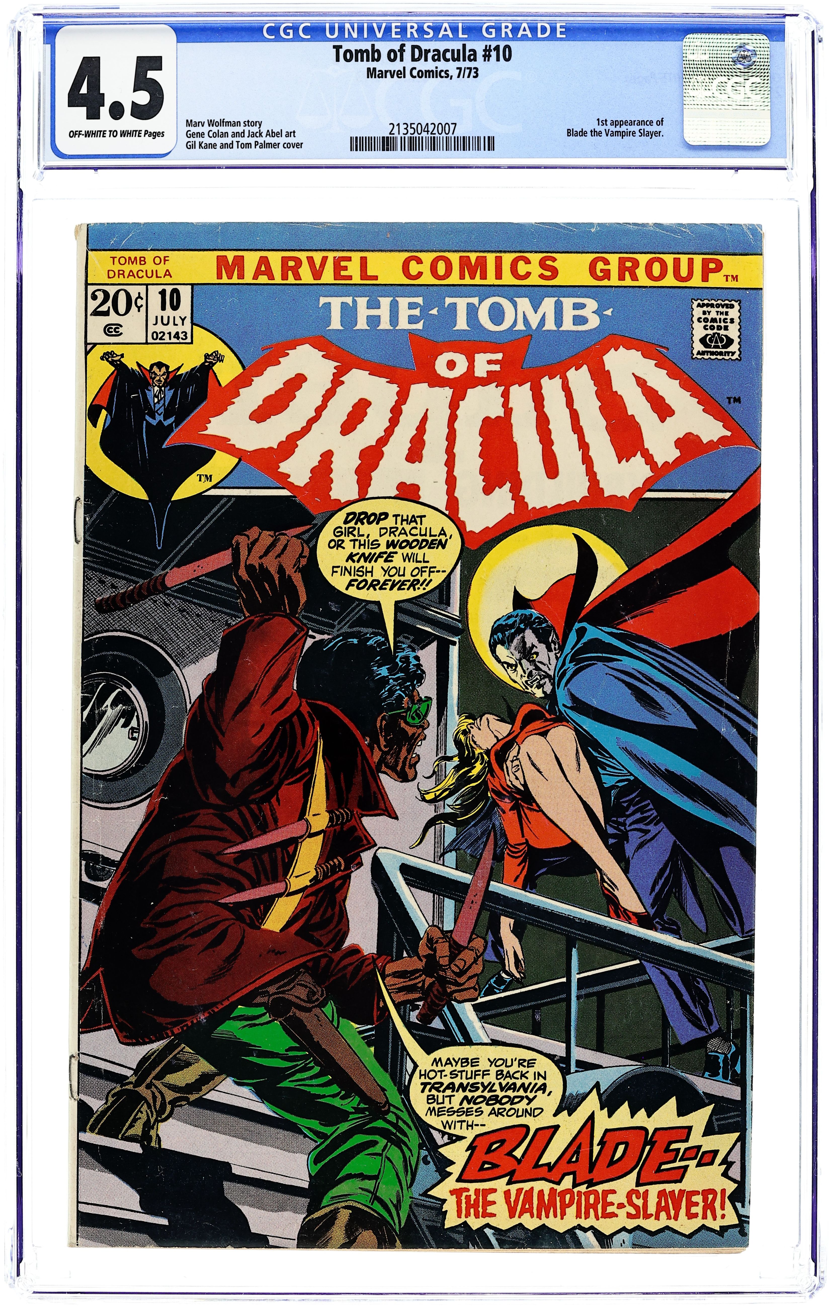 "To Kill a Vampire!" Written by Marv Wolfman. Art by Gene Colan and Tom Palmer. The slayers have finally tracked Dracula back to his layer, but can even this fierce team of vampire hunters destroy the most powerful vampire to ever stalk the earth? Plus, the origin of Blade! 32 pages, FC. Cover price $0.20.
