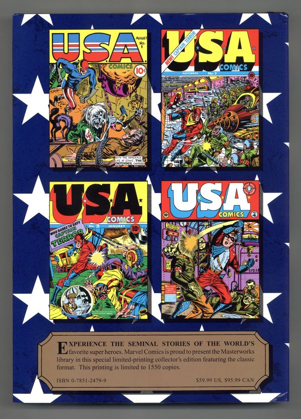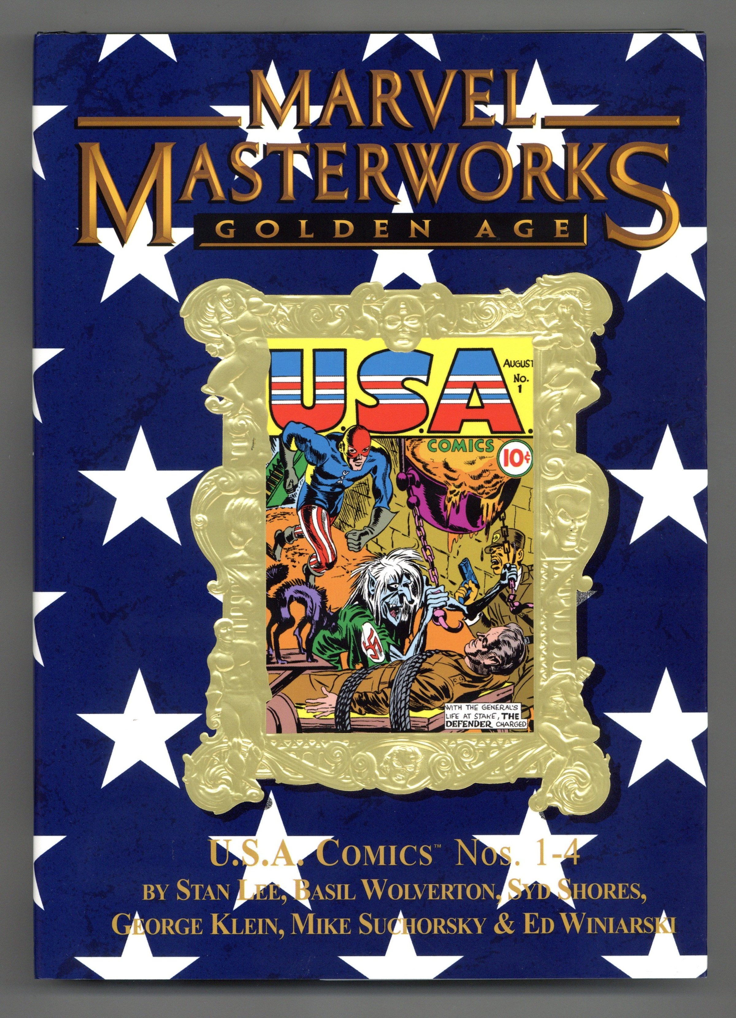 Starts Apr 20 Volume 76 - 1st printing. "GOLDEN AGE USA COMICS!" Collects USA Comics (1941) #1-4. By JACK KIRBY, JOE SIMON, CHARLES NICHOLAS, AL AVISON, PHIL STURM, SYD SHORES, STAN LEE, BASIL WOLVERTON, MIKE ROY, FRANK GIACOIA, AL EADEH, ED WINIARSKI, GEORGE KLEIN, MIKE SEKOWSKY, and AL GABRIELE. Cover by JACK KIRBY and JOE SIMON. Introduction by Michael J. Vassallo. Marvel proudly presents more Golden Age goodness from 1941. The Defender! Major Liberty! Rockman! Rusty! The original Young Avenger! The origins of the Whizzer, Jack Frost and the Vagabond! Captain Terror turns back a deadly Nazi undersea invasion! Stan 'The Man' himself chronicles the historic first meeting of the USA heroes! This hardcover collection remasters and restores these early adventures, some collected for the very first time! Hardcover, 280 pages, full color. Cover price $59.99.
