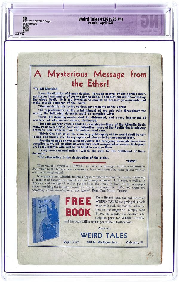 Tags: Anthology / CollectionPublished Apr 1935 by Weird Tales.Weird Tales (1923-1985 Popular Fiction) Pulp 1st Series Vol. 25 #4 CGC Coverless Restored