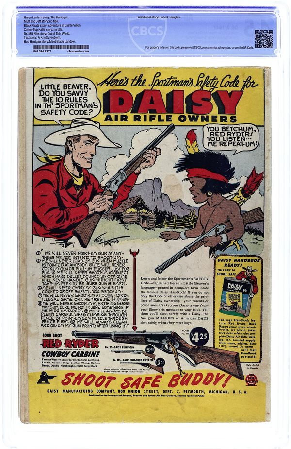 Starts Apr 4 Cover art by Alex Toth. The Icicle Goes South, script by Robert Kanigher, art by Alexander Toth; Green Lantern must stop the Icicle in his attempts to aid a dictator wanting to take over a South American Nation. The Crying Kid starring Cotton-Top Katie, script and art by Harry Lampert (signed as Harrielle). The Phantom Fleet starring The Black Pirate, pencils by Arthur F. Peddy, inks by Bernard Sachs. The Modern Wreckers starring Hop Harrigan, art by Howard Purcell. Seconds to Live starring Dr. Mid-Nite, pencils by Arthur F. Peddy, inks by Bernard Sachs; Dr. McNider is drugged and nearly shot by his host while at a dinner, but later escapes, and, garbed as Dr. Mid-Nite, helps to rescue his secretary Myra from the clutches of the man's henchmen. Mutt and Jeff strips by Al Smith [signed as Bud Fisher]. 52 pgs. $0.10. Cover price $0.10.