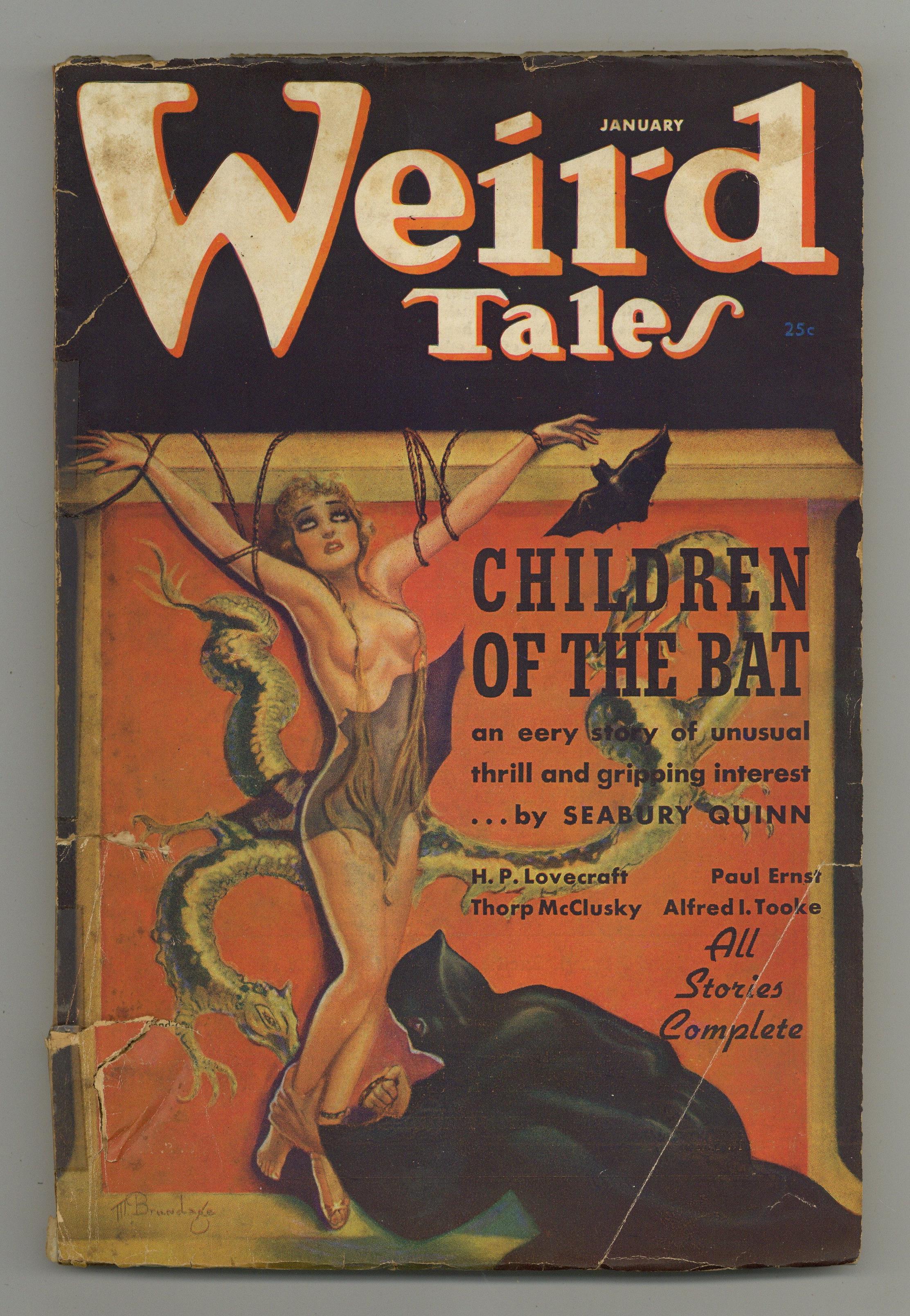 Starts Apr 4 Cover by Margaret Brundage. "The Thing on the Door-step" by H. P. Lovecraft, other stories by Seabury Quinn, Paul Ernst, Thorp McClusky, Alfred I. Tooke, G. Garnet, Henry Kuttner, Duane W. Rimel, Durbin Lee Horner, G. G. Pendarves. Illustrations by Virgil Finlay. 6 1/2-in. x 10-in.; black and white (text); 128 newsprint pages. Cover price $0.25.