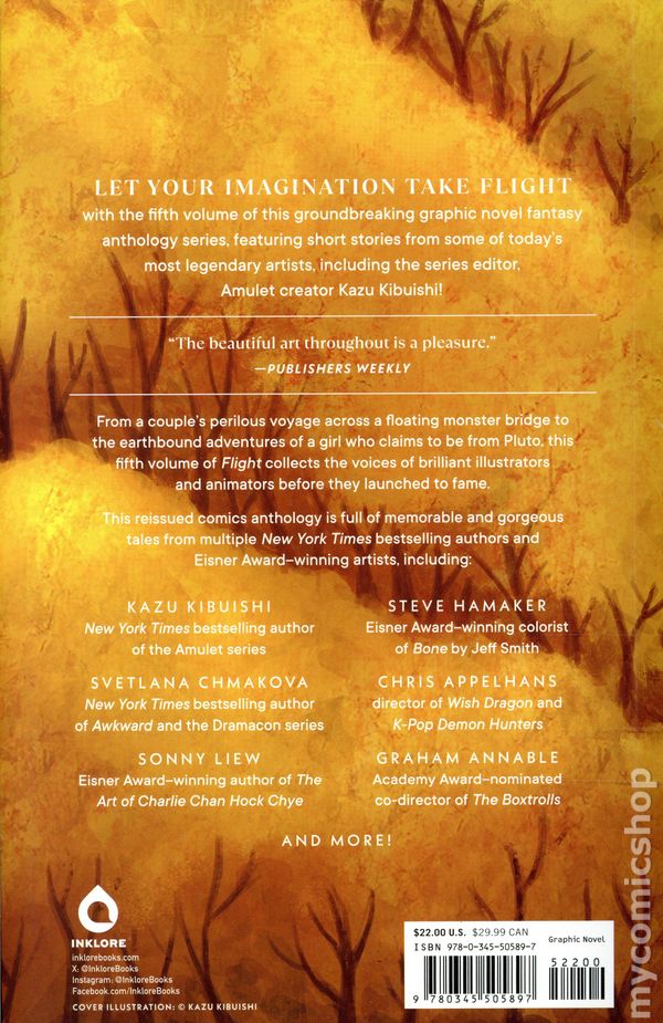 Volume 4 - 2nd and later printings. By Kazu Kibuishi. The previous three editions of Flight have propelled this anthology to the forefront of the graphic novel industry, garnering award nominations, creating great buzz for BEA, Comic-Con, and other like-minded conventions, and generally striking a fresh note among jaded comics readers. Flight Volume 2 was a Harvey Award finalist for Best Anthology. Softcover, 346 pages, full color. Cover price $24.95.